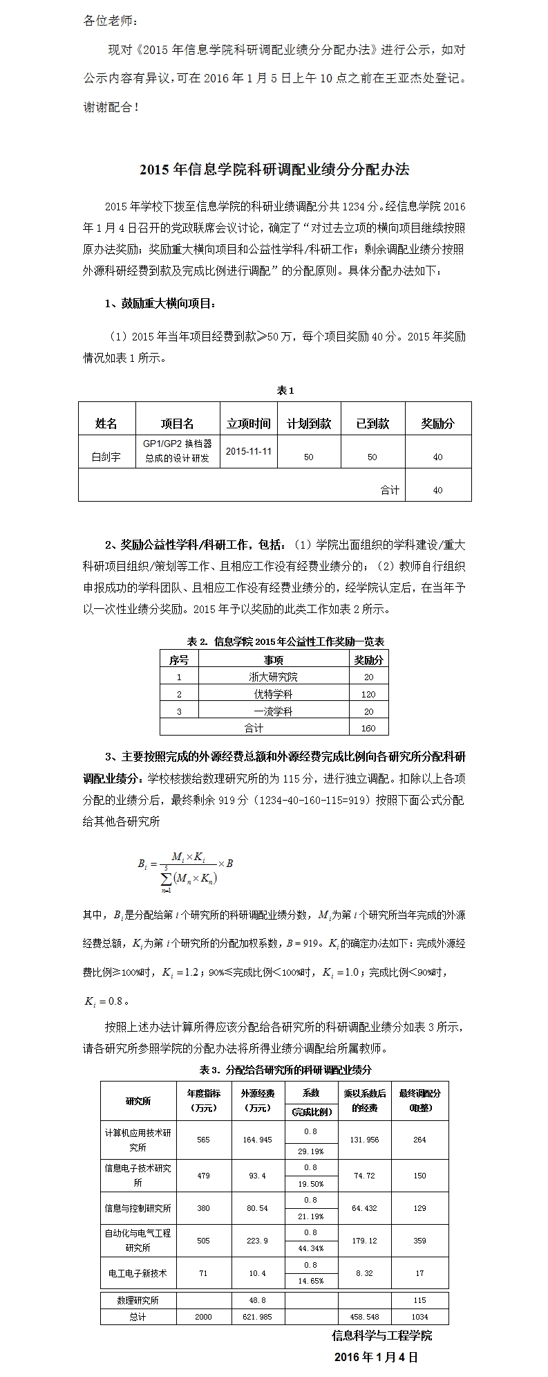 关于《2015年永利65335com科研调配业绩分分配方法》公示的通知