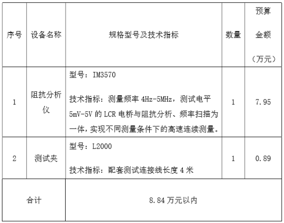 经浙江大学宁波理工公司招投标委员会研究,决定对永利65335com阻抗分析仪进行询价采购,设备总预算8.84万元,欢迎合格的供应商参加,并于2019年7月1日前用特快专递将标书、单位资质及相关资料寄至或密封交至浙江大学宁波理工公司永利65335comNA206孙炯处。