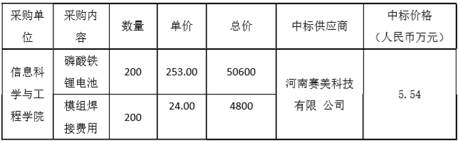 根据《浙江大学宁波理工公司招投标管理办法》的相关文件,永利65335com对磷酸铁锂电池进行了询价,经过评标小组评审,现将采购结果公告如下: