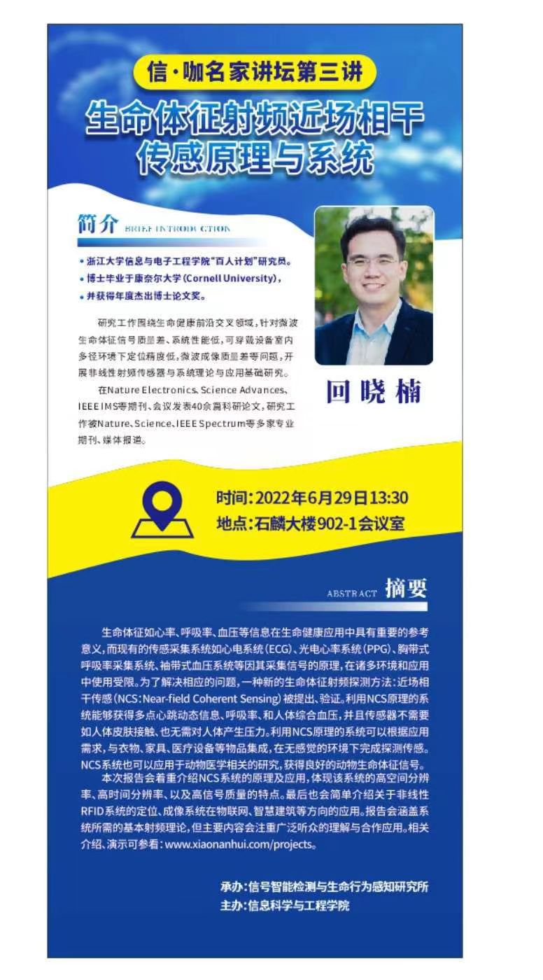 简介:浙江大学信息与电子工程公司“百人计划”研究员。博士毕业于康奈尔大学(CornellUniversity),并获得年度杰出博士论文奖。研究工作围绕生命健康前沿交叉领域,针对微波生命体征信号质量差、系统性能低,可穿戴设备室内多径环境下定位精度低,微波成像质量差等问题,开展非线性射频传感器与系统理论与应用基础研究。在NatureElectronics、ScienceAdvances、IEEEIMS等期刊、会议发表40余篇科研论文,研究工作被Nature、Science、IEEESpectrum等多家专业期刊、媒体报道。