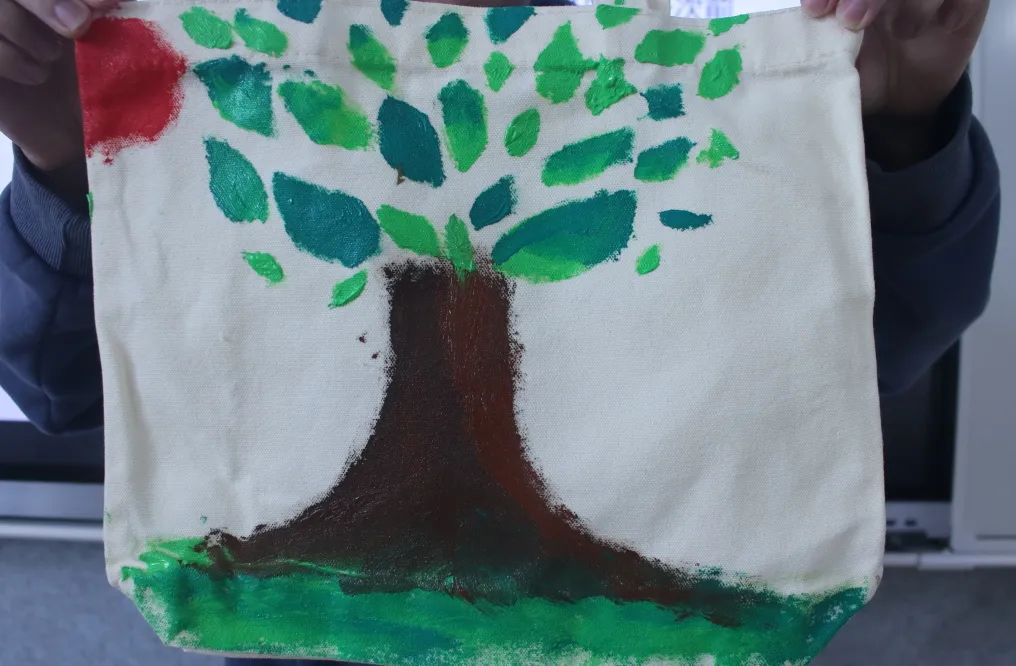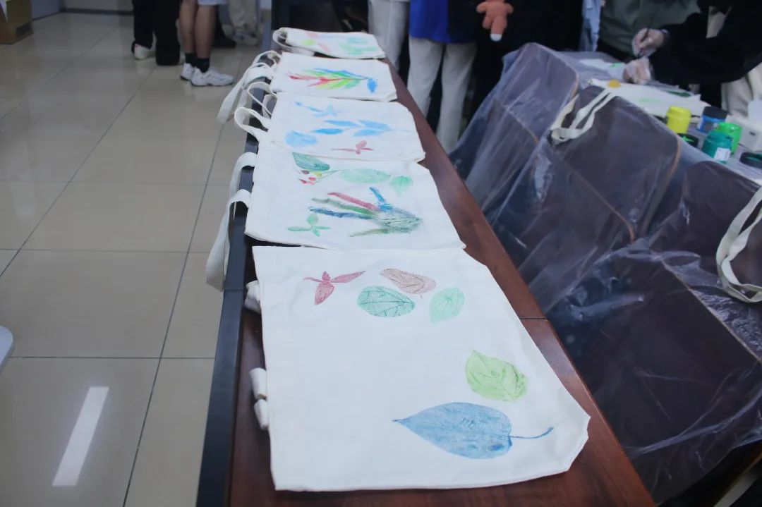 本次活动以拓染工具与植物相约为主题,同学们在活动开始前自行选择了拓染布料(帆布袋),并使用在校园内收集了各种植物素材。从校园里的嫩绿小草到色彩斑斓的花朵,每一样都成为了他们创作的灵感源泉。