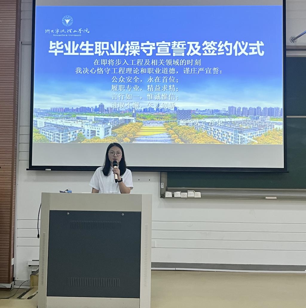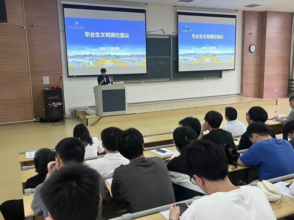 电信202班毕业生翁亨鹏发起了毕业生文明离校倡议,呼吁同学们珍惜进入倒计时的大学时光,积极投身就业,注意毕业季人身、财产安全。随后,电信204班毕业生汪果带领全体毕业生进行职业操守宣誓仪式。