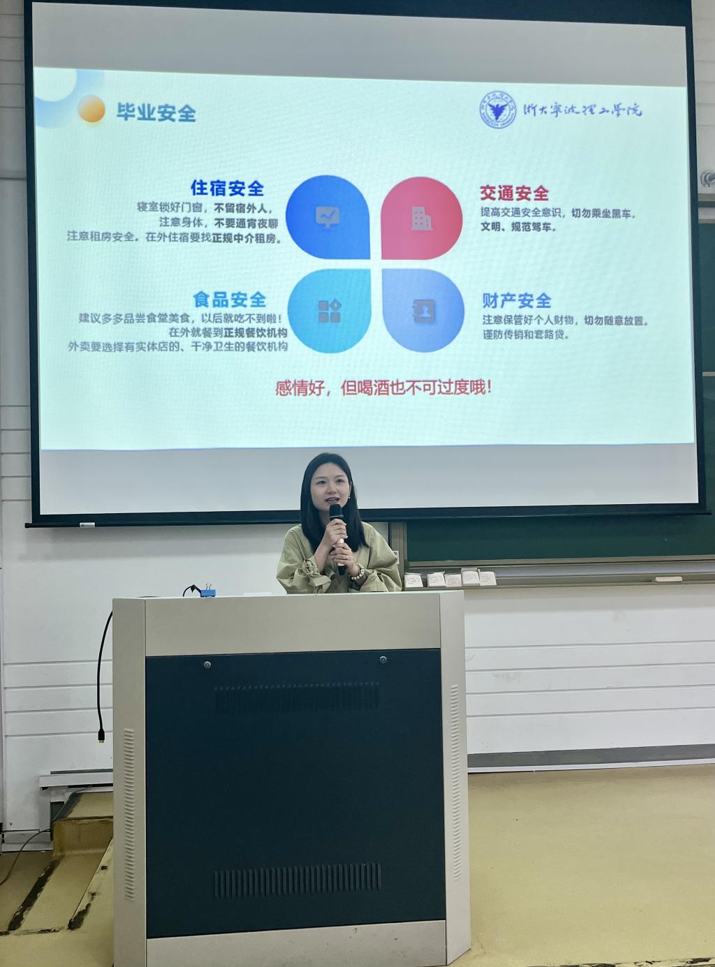 集团安全保卫处仇梦华结合实际案例,从离校人身安全、财务安全等方面为毕业生上了一堂生动的安全教育课。