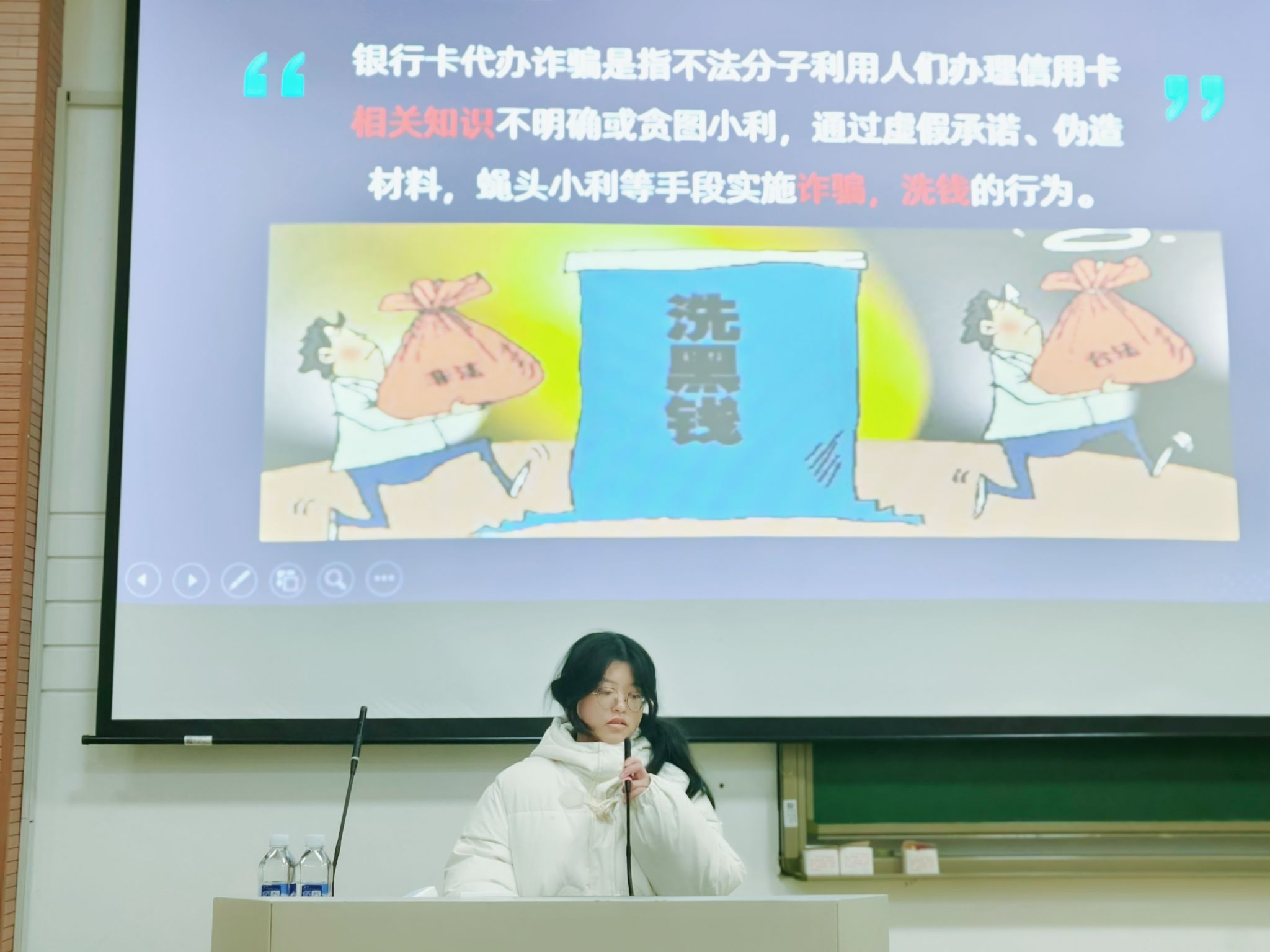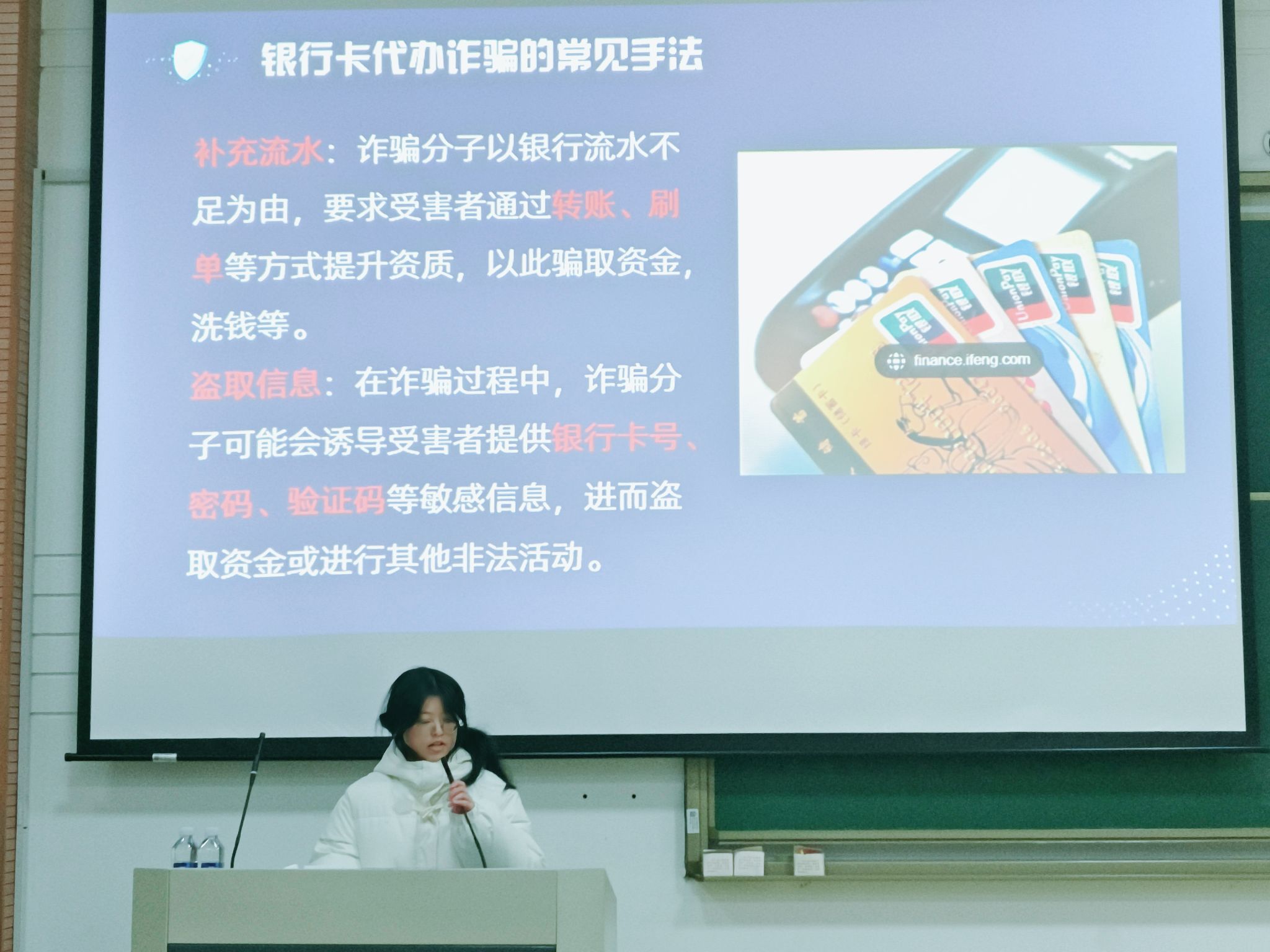 程思瑜同学围绕银行卡代办反诈进行了宣讲。她首先对借用银行卡诈骗进行了概述,随后详细讲解了银行卡代办诈骗的常见手法。程同学还就如何识别与防范银行卡代办诈骗提出了个人防范建议,为在场员工提供了实用的防骗技巧。
