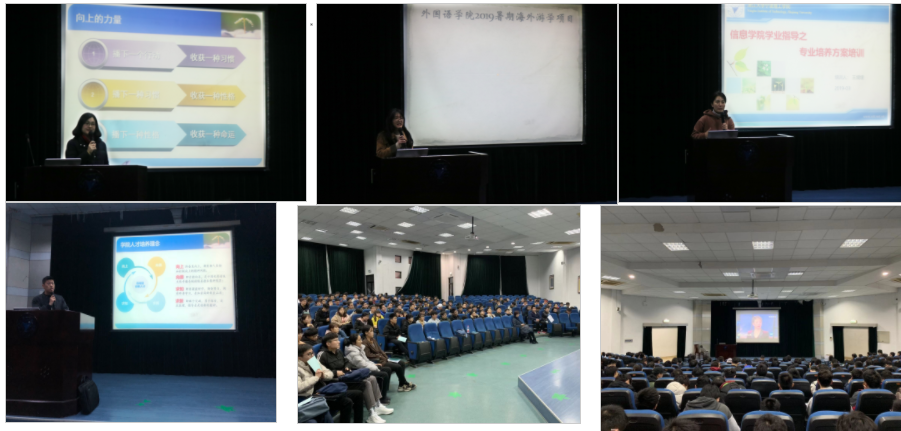 会议伊始,教务办副主管王媛媛老师向同学们解读了大一新生培养方案,以数据兼并文字的形式分析了各班第一学期学业表现以及各专业毕业的学分要求。随后,周维老师介绍了外语公司的美国、波兰、日本三个暑期游学团项目,从学习、科技、文化、校园生活等几个维度分享了自己在外游学时的切身体会。周老师的幽默风趣及富有具感染力的发言,引起了同学们极大的兴趣。接着,学工办三位老师依次就公司近期学风建设情况、安全稳定、升学、就业、团学、公益e青年、学科竞赛等相关工作作具体通报和部署,重点解读了大一新生评奖评优政策。