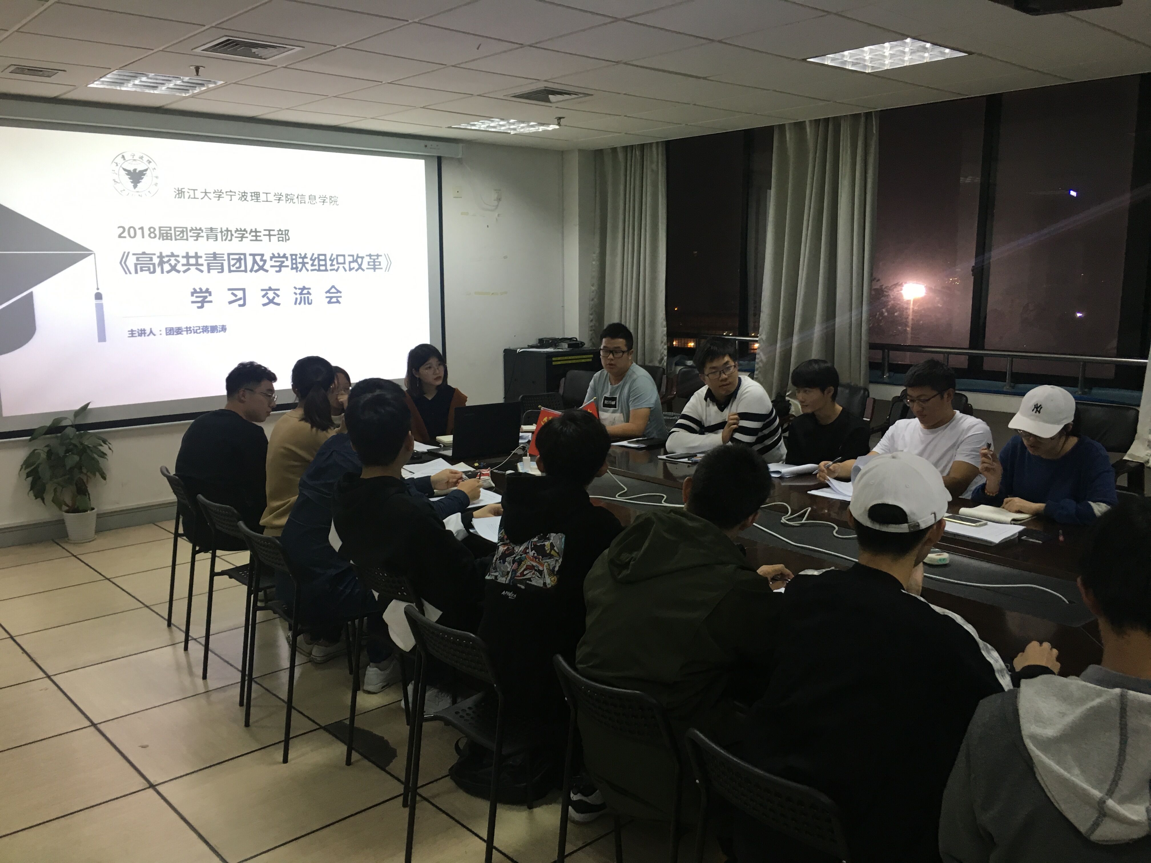 在交流会上,蒋鹏涛老师根据共青团改革实施方案对公司建设进行工作部署,明确改革方案实施的指导思想、基本原则、主要目标。希望团学能够构建项目化、扁平化、制度化的工作机制,提高团学的工作效率,促进“挑战杯”等项目的运行规范和内涵提升,打造“i成长”“i学习”“i文化”等永利65335com团学品牌活动。同时提出要完善团学组织格局,落实部门责任制度,以团委为核心和枢纽,以员工会为员工自我服务、自我管理、自我教育、自我监督的主体,以员工社团及相关员工组织为外围延伸手臂。希望信息团学能够不断发展,不断进步。全体同学都认真聆听,受益匪浅。