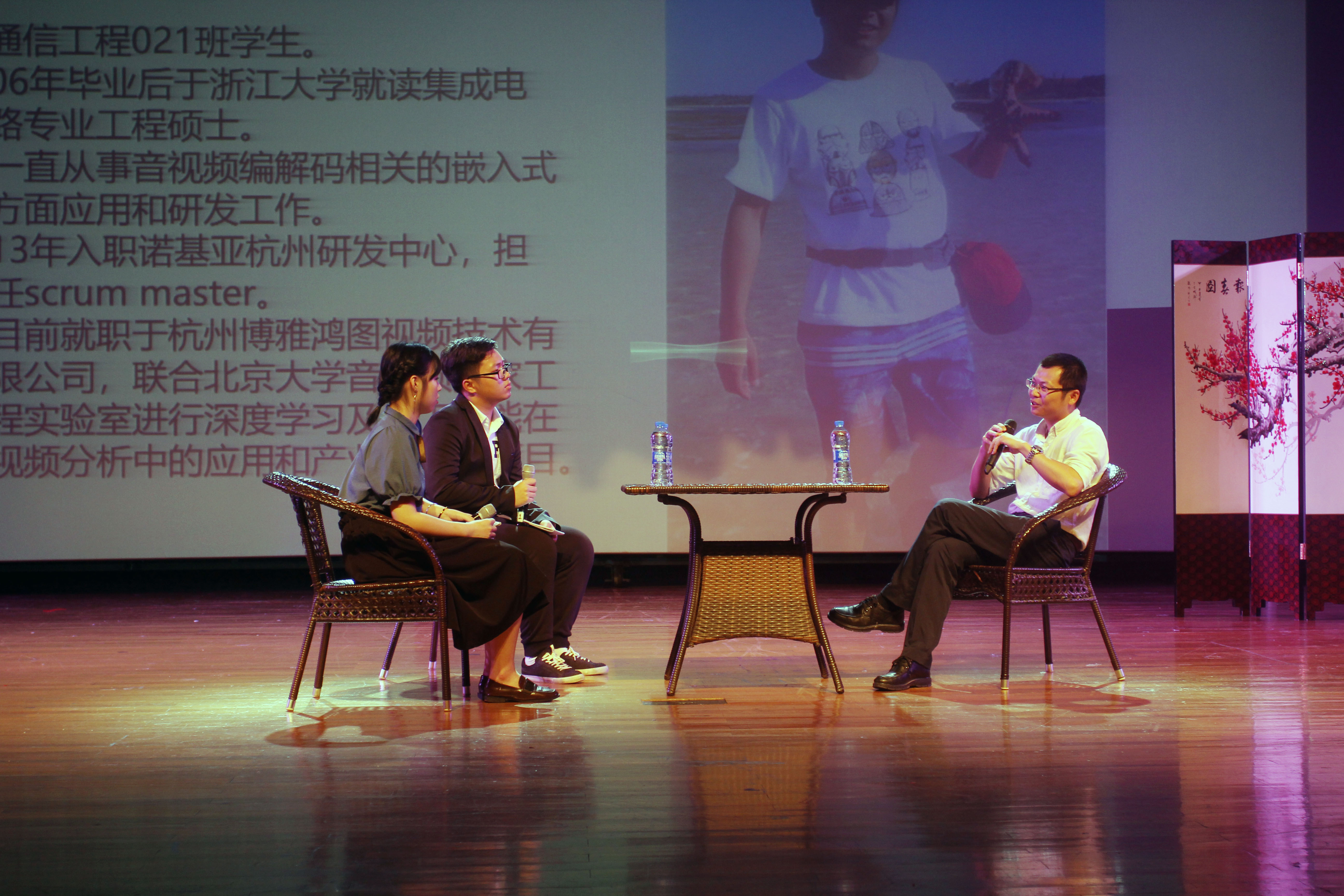 成长论坛采取采访的形式,让员工和嘉宾能够拉近距离,真切感受。第一位采访的刘亮学长,他是通信工程2002级班的员工,是浙江大学研究生。他认为像数学、线性代数这一类的课程非常的重要,可以开阔员工们的思维。当然,专业知识也很重要,在大学中,一定要学好专业知识,不过大学中所学的东西还不够满足工作的需求,员工们可以通过考研或出国来达到更深层次的学习。刘亮学长踏实好学的认真态度引起了同学们的共鸣。