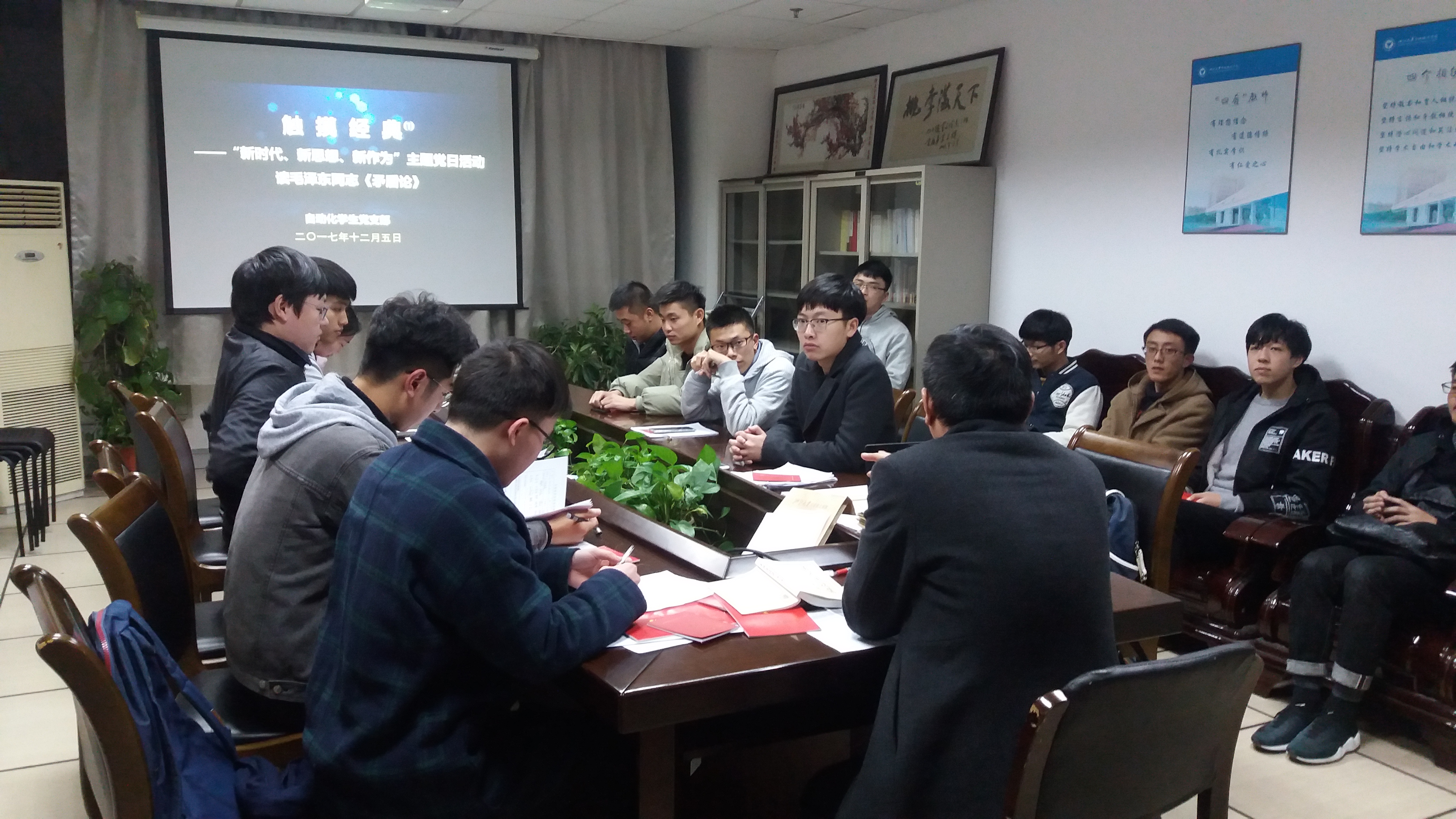 为深入学习十九大报告,贯彻落实中共教育部党组关于《高校思想政治工作质量提升工程实施纲要》的通知(【2017】62号),永利65335com自动化员工党支部于2017年12月5日晚在石麟903-3党员之家组织开展第一期“触摸经典”理论学习活动。活动以“新时代、新思想、新行动”为主题,以马列经典为基础,旨在发挥文化育人的功能,提升青年老员工党员的理论素养,增强理解习近平新时代中国特色社会主义思想的能力。理论学习由自动化员工党支部书记徐益亮老师主讲,支部全体党员参加了会议。