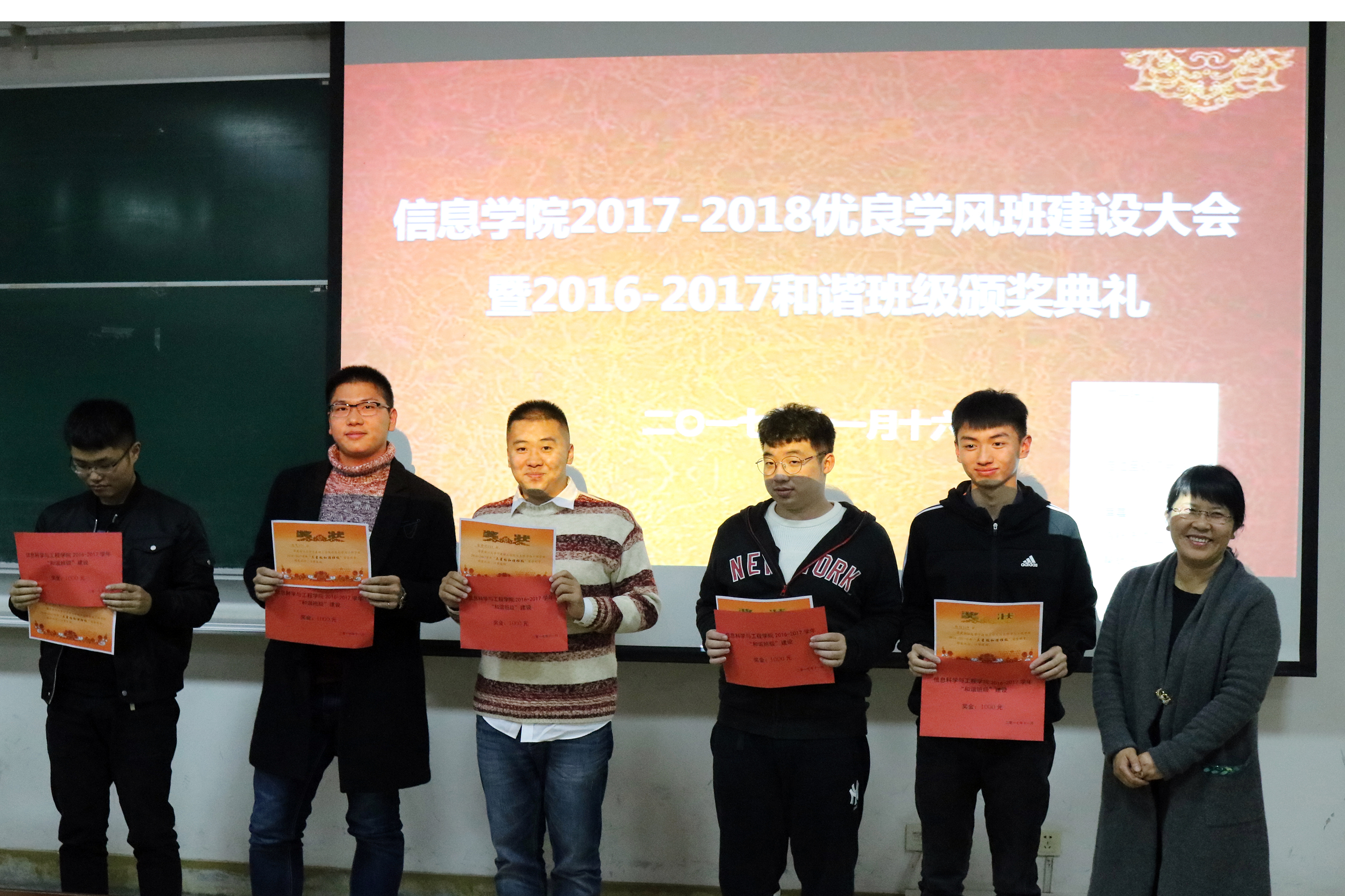 会议伊始,由徐益亮老师向同学们介绍了本年度的学风工作情况,包括公司基本情况、学风建设规章制度、员工学业预警制度以及学科竞赛和学术活动,同时介绍了定期召开工作例会,抽查到课情况,辅导员督查课堂等主要做法,得到一定成效,同时发现了班级出勤率差异,晚自习出勤率低,学习态度等存在的问题并提出对策。随后徐益亮老师对接下来的工作开展部署,内容涵盖优良学风建设,和谐班级建设,组织开展班会,认真准备申报材料,还重点强调了班级荣誉感。第二项议程,由龚欣欣老师宣布优良学风班与和谐班级名单,并由傅老师和龚老师为他们颁奖。紧接着通信141班长陈扬与电信162班长林裕强分别作班级工作总结汇报——简介班级概况,反思存在的不足和对未来发展的计划。