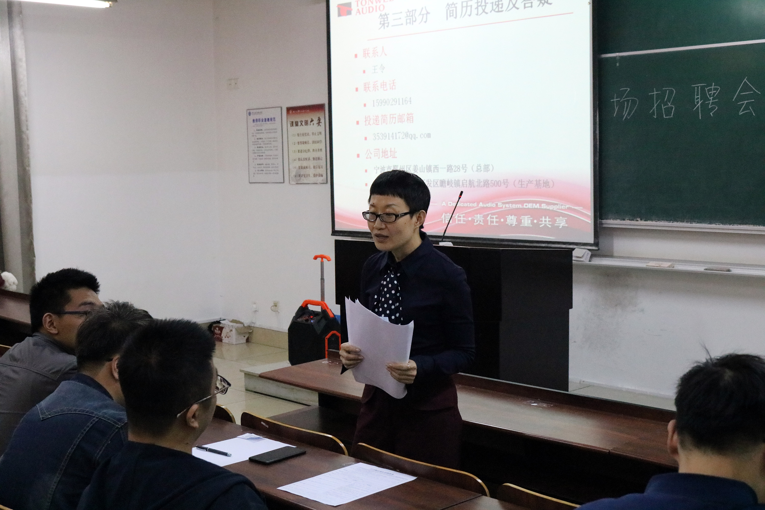 为切实做好永利65335com毕业生就业工作,大力构建毕业生与用人单位的交流平台,积极为用人单位输送应用型人才,由永利65335com与宁波东源音响有限公司联合举办的招聘会于11月3日晚上6时整在NB122准时召开。