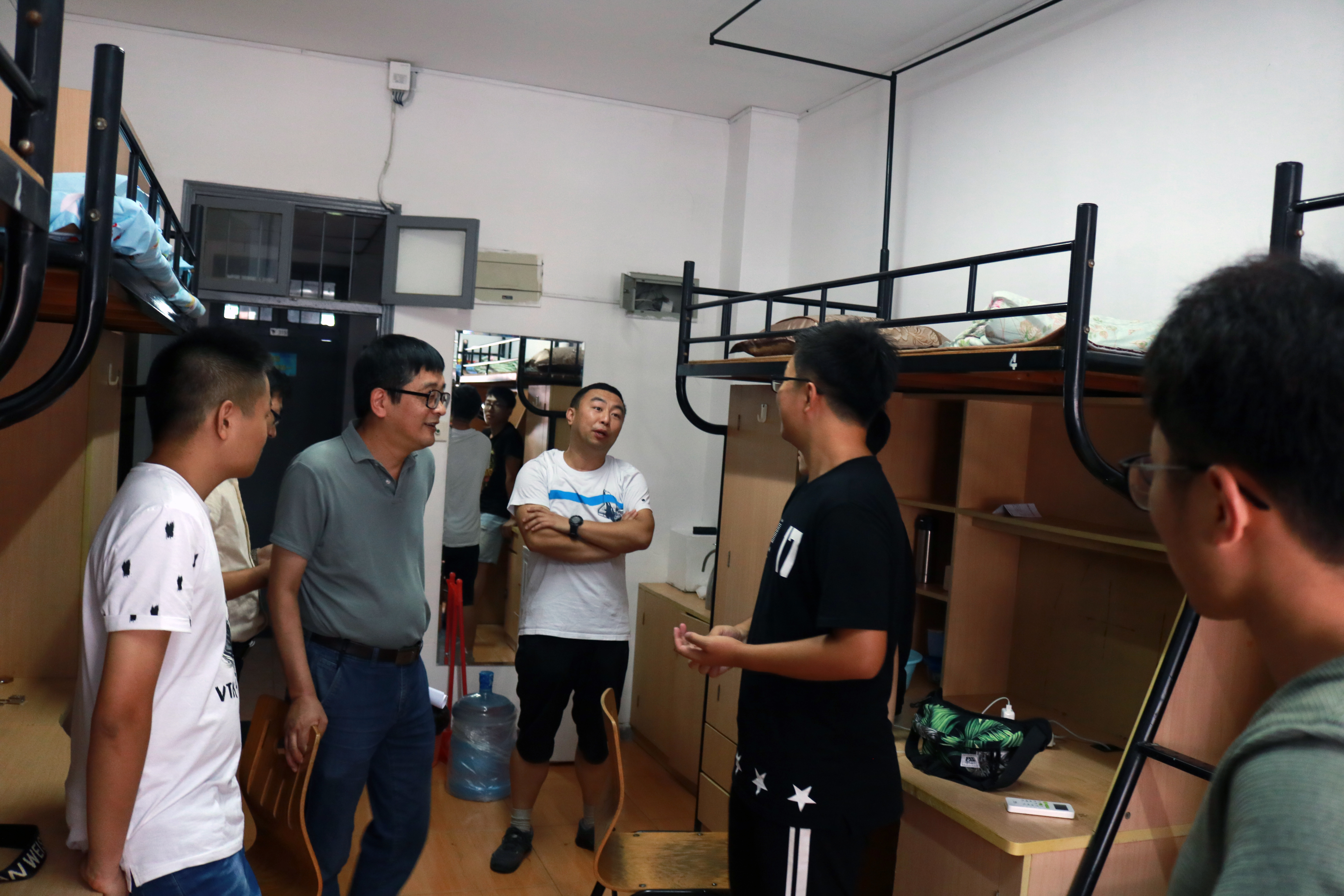 为迎接新生,了解新生面貌,永利65335com党委书记胡超老师、党委副书记傅晓宇老师、副经理陶吉利老师、经理助理裘君老师,以及辅导员杜明珠老师、龚欣欣老师、徐益亮老师于9月3日下午3时下寝慰问新生。