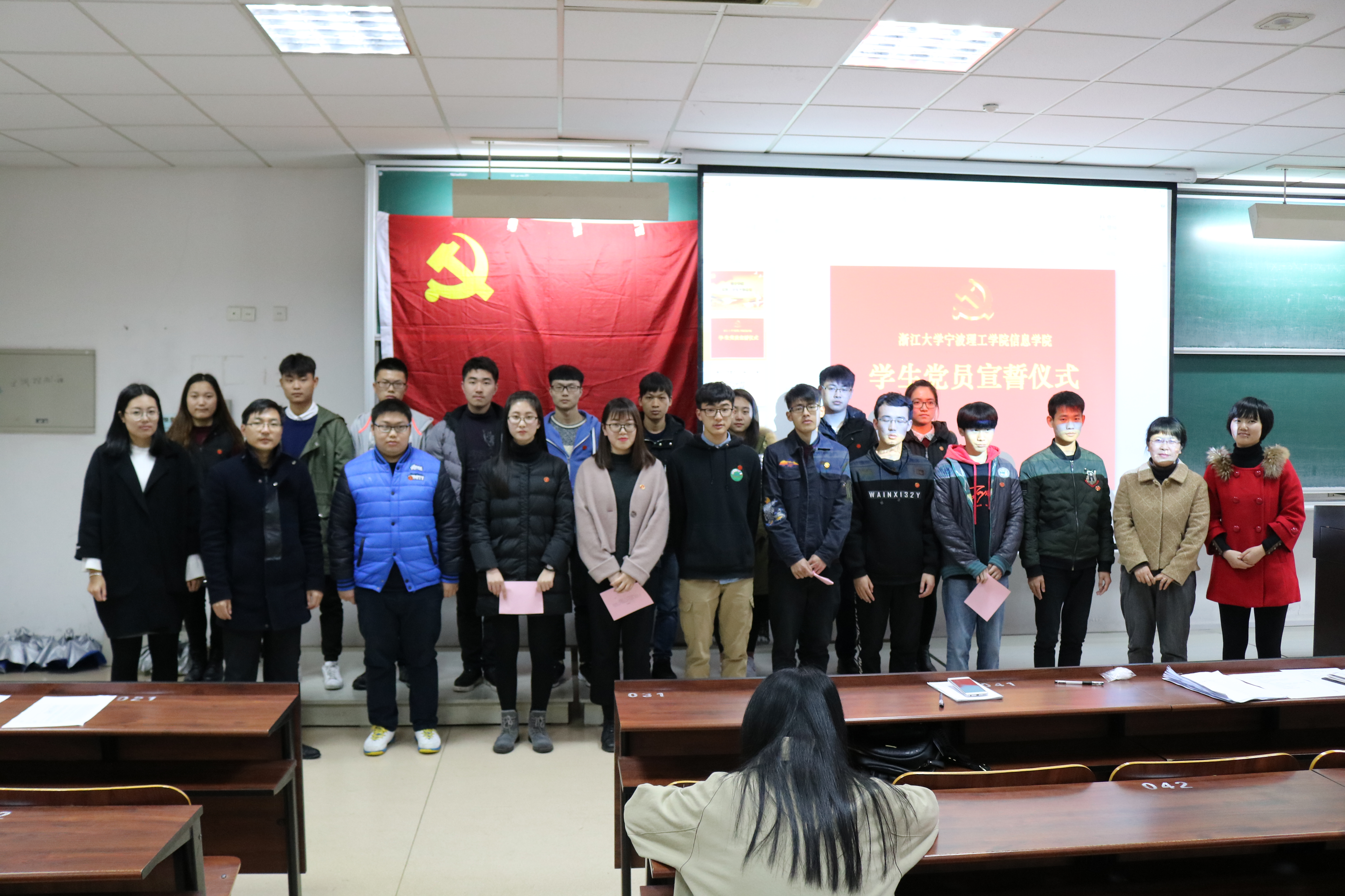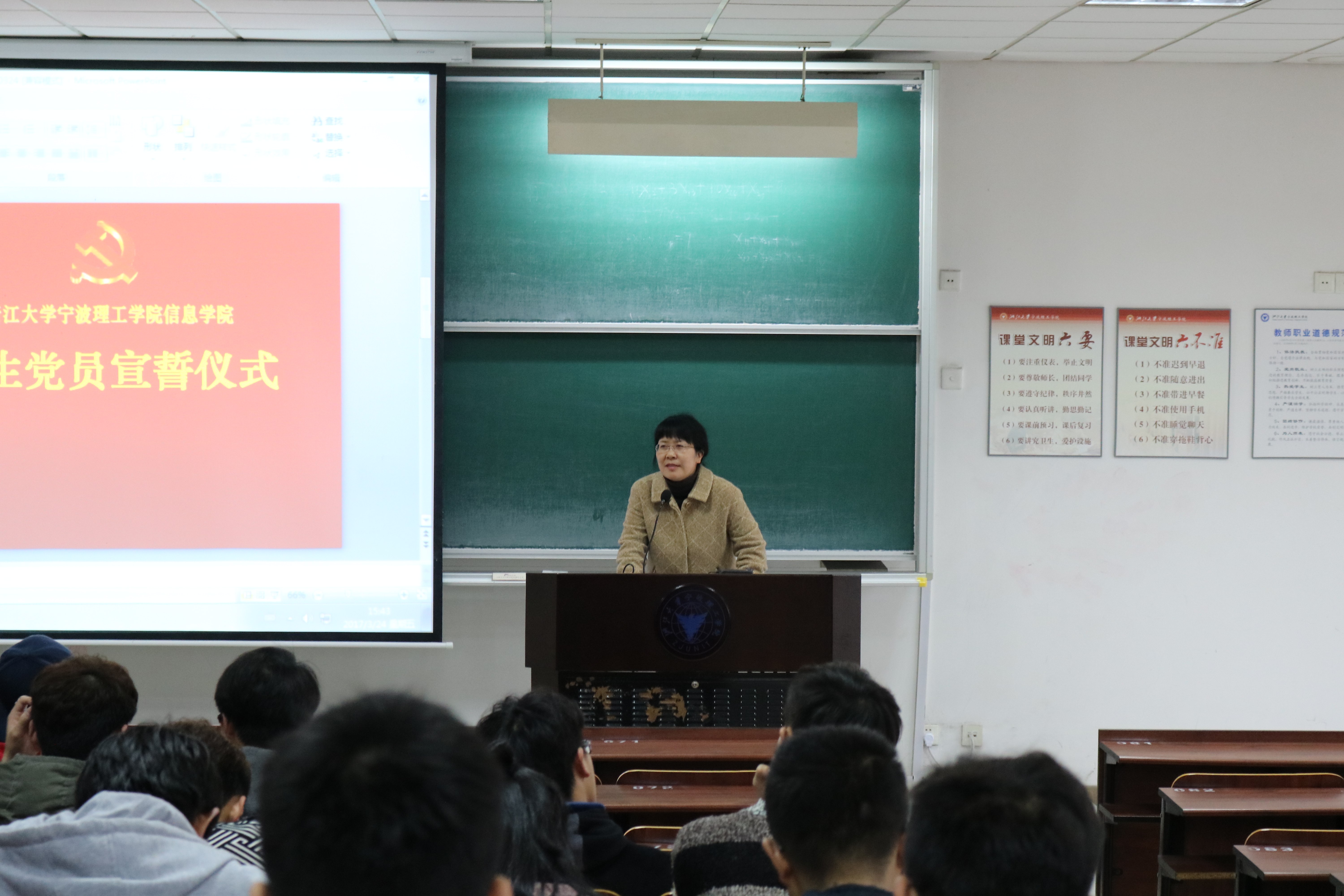 会议的第一项议程是新一批党员入党宣誓仪式。与会老师以及员工党员代表为各位新党员郑重地佩戴党徽,新党员们在鲜红的党旗下,字字铿锵宣读了入党誓词。随后,新党员代表王茹同学上台发言,表明作为一名党员的态度和决心。仪式的最后,党总支副书记傅晓宇老师对新发展党员以及台下所有党员和员工干部提出了殷切希望,同时,傅老师对全国高校思政工作会议精神和浙江省高校思政工作会议精神进行了传达,针对夏宝龙书记讲话“十要”精神进行了深入阐述,以此勉励在座党员和员工干部坚定理想信念、提高政治素养,增强责任意识、做好本职工作,主动学习实践、发挥模范作用,更加强调作为一名员工党员要“在党爱党、在党言党、在党为党”,积极投入“双百双进”、“美丽浙江建设”的行动中去,用自己的实际行动践行党员的义务。入党宣誓仪式结束后,杜明珠老师、徐益亮老师、龚欣欣老师就学风建设、文明寝室建设、团学活动等工作在会上向全体党员和员工干部作了通报,对本学期的工作做了布置。