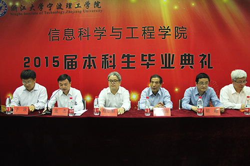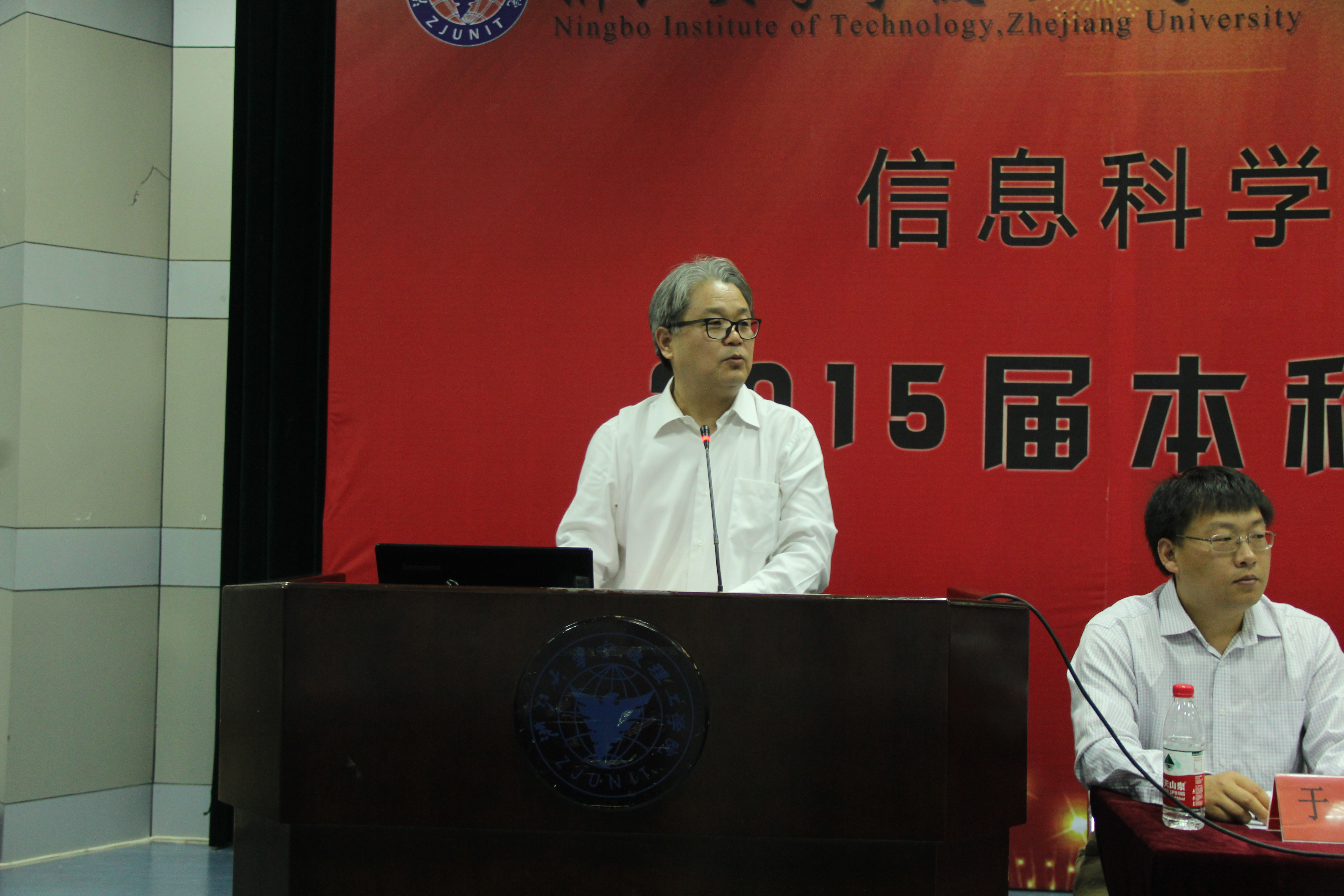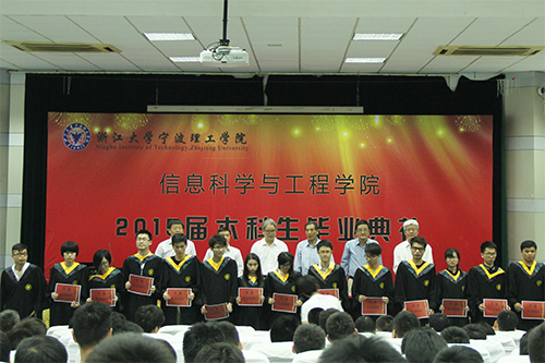 典礼在雄壮的国歌声中拉开帷幕。首先,副经理胡超老师致辞。胡老师的致辞将老师和同学们带入四年时光中,回首过去,着眼当下,展望未来。他勉励同学们,用初心去探索人生意义,努力认识自己,做好自己,坚守内心选择为实现自己的人生意义与人生价值而勇敢、专注的行动。接着,于欣老师宣读了省级、校级优秀毕业生名单。随后,于在河老师宣读永利65335com2015届考取国内研究生、出国(境)深造和创业员工名单。紧接着,信息公司经理赵光宙教授为毕业生代表颁发毕业证书,在场的领导们为优秀毕业生们颁发了荣誉证书,为继续深造员工颁发了奖金。随后,来自信计111班的王珊同学作为优秀毕业生代表上台发言。表达了对母校和师长们的不舍和眷恋,对匆匆四年大学时光的怀念。在场同学皆有所触动。