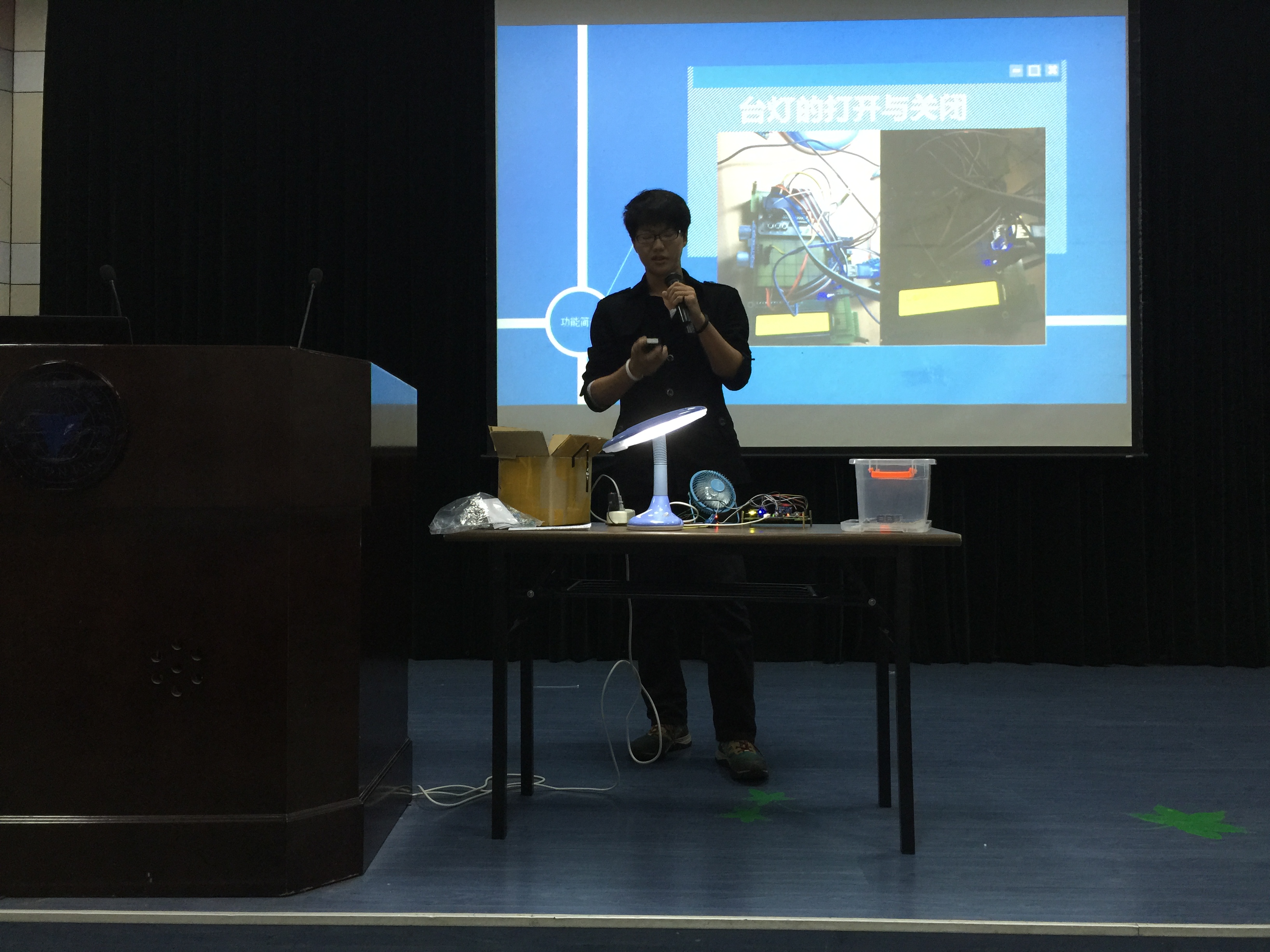 接着,自动化122班的周乐同学为大家带来了他制作的“智能家居”系统。一块稀疏平常的51单片机板,在周乐同学的设计下,借助手机操控,变成了一个可以控制家里所有家用电器的“智能家居”系统。借助这个系统,你可以在床上躺着休息时,通过手机操控家里的电视机、空调、风扇等家电的开关,实现了家居生活的智能化。周乐同学的亲身实践正印证了那句“只有想不到,没有做不到”。