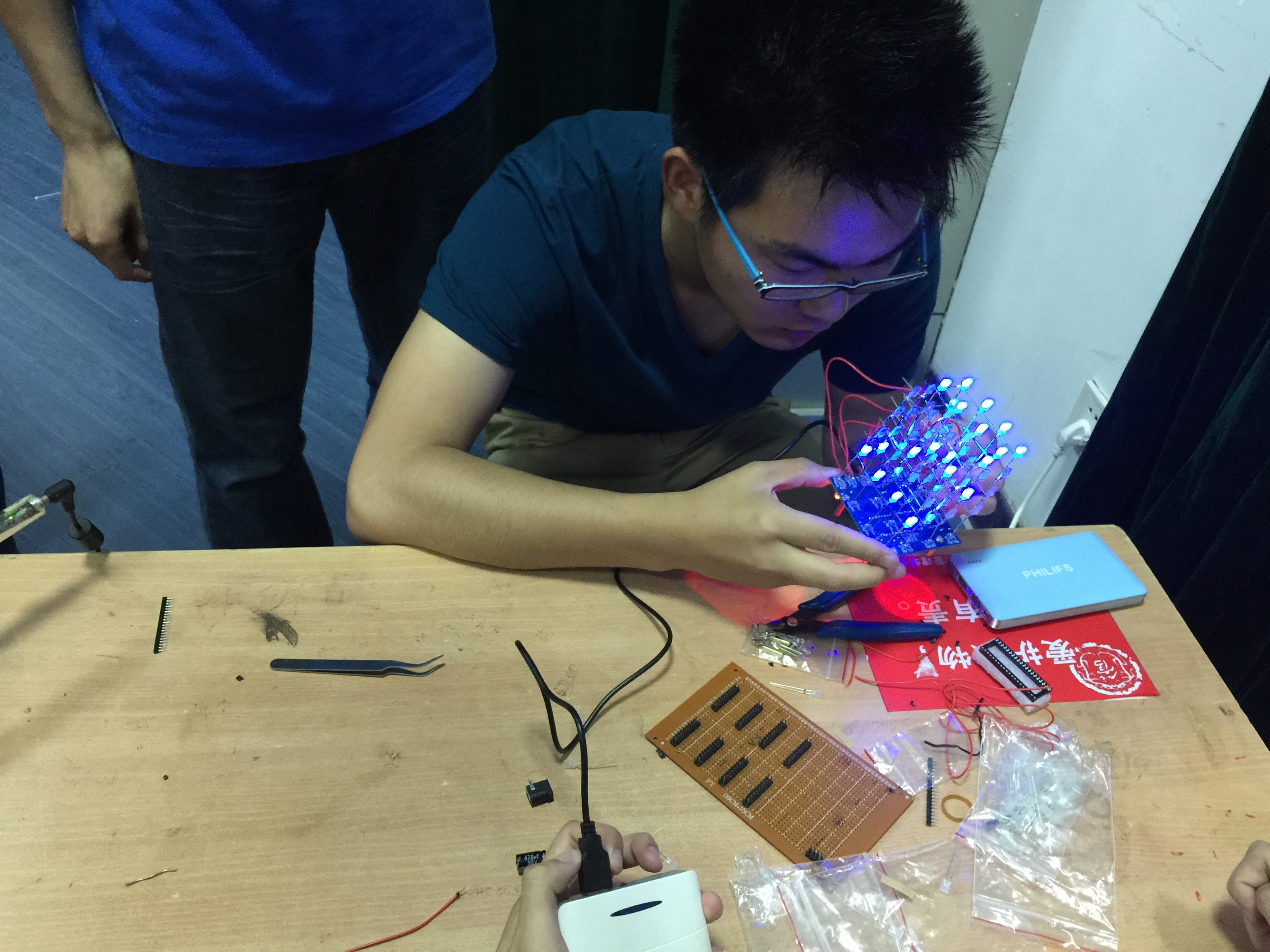首先是由通信工程131班的章丽姣同学带来的关于“光立方”的讲解和展示。章丽姣同学手中“光立方”是4*4*4基于51单片机的DIY电子设计套件,主要由64个单色蓝光的LED灯和STC12C5A60S2单片机组成。通过电脑编程,她可以控制任意一个LED灯的闪灭,通过复杂的程序操控,“光立方”呈现出各种绚丽的效果,让现场同学啧啧称奇。章丽姣同学介绍到,“光立方”这项技术,也被应用在各种大型晚会现场,离我们并不遥远。讲解后,主持人邀请观众现场进行“光立方”的制作,亲身体验这项科技。
