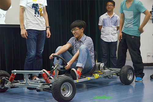 就在同学们为眼前的科技着迷的时候,一辆卡丁车缓缓驶入活动现场,引发全场的惊呼和掌声。这是由宁波NEXMAKER资深创客吴波先生和自动化131班徐俊同学等人一起亲手打造的智能卡丁车。吴波先生向同学们介绍了卡丁车最初的灵感来源与整体设计。徐俊同学负责了卡丁车的整个动力系统,他向同学们介绍了这套低能耗、强功率的动力系统,并邀请现场同学亲自驾驶卡丁车,感受科技的魅力。