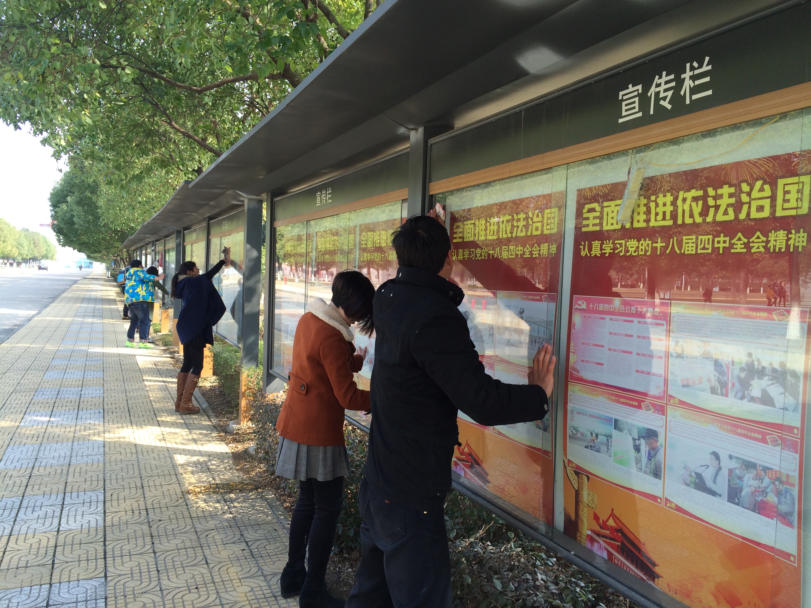 当天下午3点,电气党总支部的同学们手持清洁工具,迈着激扬的步伐,各小组向着不同的地方出发。各小组成员开始分工合作,积极清洁了校园展板橱窗。经过同学们的努力,明亮的橱窗印称着蓝天白云显得洁净如新。