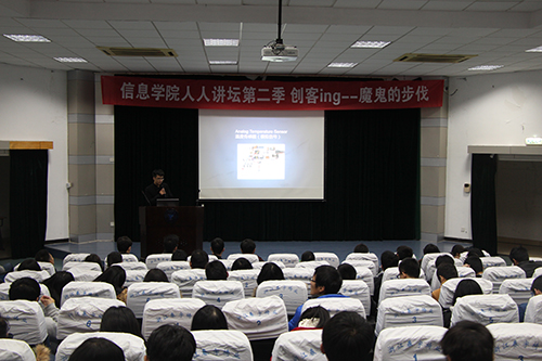 首先发言的嘉宾是NexMaker的总裁陈旺先生。陈旺先生以互联网的发展作为铺垫,介绍了NexMaker的发展,并且鼓励员工不要轻易放弃,在认真学习专业知识的同时也要着重培养自己的创新精神。第二位上场的是毕业后毅然走上“创客”之路的员工陈方毅,他介绍了一个高性能、高性价比的迷你PC平台“pcduino”的创作与原理。随后,“创客”吴波介绍了3D打印机的原理,向同学们讲述了3D打印机的未来发展方向,现场给同学们展示的3D打印成品引发同学们的啧啧称奇。第四位上场的嘉宾介绍了中科智慧家电以及阶梯科技。最后一位出场的是胡谢杰同学——宁波首个真人版钢铁侠的制作者。他幽默风趣地讲述了自己制作钢铁侠的过程,包括制作过程中面临的困难以及自己如何克服这些困难。