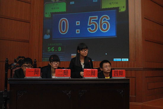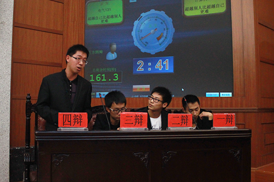 本场辩论赛分为两场,决出季亚冠军的获得班级。第一场围绕主题“上网看世界和出门看世界何者更有收获”的主题展开,电信133班担任正方,电气132班为反方。第二场围绕“超越自己和超越别人何者更难”的主题展开,正方电气131班和反方计算机131班展开了又一场激烈的辩论。比赛中,正反方引经据典、灵活攻辩,而最激烈的莫过于自由辩论阶段,每个选手绷紧神经,情绪高昂,其富有攻击性的提问,巧妙的躲闪回击博得阵阵掌声,将整场辩论推向高潮。经过激烈的角逐,电气131班获得冠军,计算机131班获得亚军,电气132班获得季军。