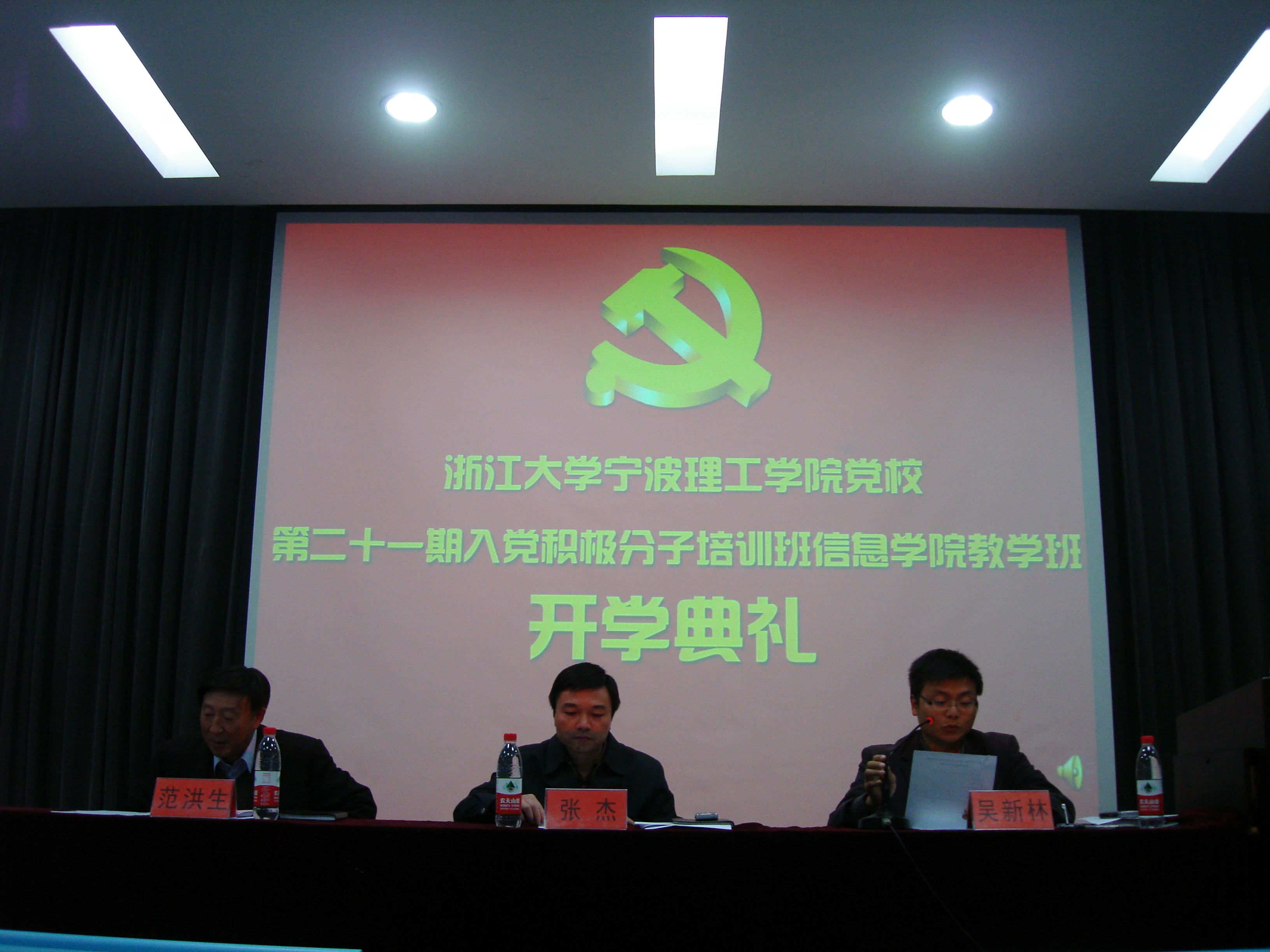 开学典礼仪式在庄严的国歌声中开始。首先,员工党建兼职组织员范洪生老师宣读了党校教学计划以及教学管理暂行规定。随后,党校学员代表信息工程类112班戴钱鸿同学发言,她表达了对党校学习的期待,表示要珍惜党校学习机会,努力提高对党的基本理论知识的认识和理解,在实践中锻炼党性,争取早日加入党组织。最后,张杰副书记做了开班动员讲话,他首先介绍了本期党校开班的基本情况,接着阐述了“端正态度,正确认识参加党校学习的重要性;把握重点,深入理解和掌握学习的主要内容;刻苦勤奋,联系实际,遵守纪律,努力提高学习效果”等三个问题,在提高学习效果的问题上,张老师还提出了“发扬勤奋学习、刻苦钻研的精神;坚持理论联系实际的原则;加强组织纪律性”等三个要求。