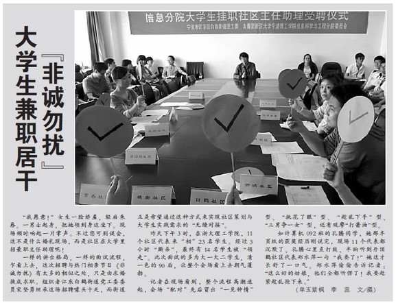 面试有25名员工参加,江东区白鹤街道团工委和信息分院团委共同对挂职员工进行面试,面试采用职来职往的形式,面试的同学每人首先进行简单的自我介绍,之后11位社区代表进行提问,在首轮中有6位同学直接被6个社区看中。第二轮,剩下的社区代表和待定同学进行相互选择,双方都同意的可以直接达成协议,最后的将会由街道进行统一安排。经过近两个小时的选拨,最终选出14名优秀员工干部赴白鹤街道担任兼职社区主任助理,另外选出2名候补人员。这14名同学将于6月初正式挂职,开展相应的社区工作,挂职为期一年。主要工作内容为政策宣讲;配合街道社区团支部,结合社区实际,开展团建活动;协助加强青少年思想道德教育;协助街道社区开展社区服务工作;协助街道社区开展社区文体活动;开展和谐社区、和谐社会宣传工作,营造社区和谐社会建设氛围。