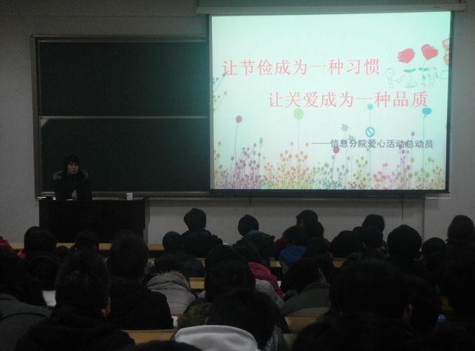 本次募爱心捐动员大会在信息分院领导的高度重视及分院同学的大力支持下,取得了圆满的成功。相信,只要我们有爱,在小的力量,也是一份支持。爱心募捐,让感动长存。