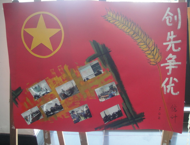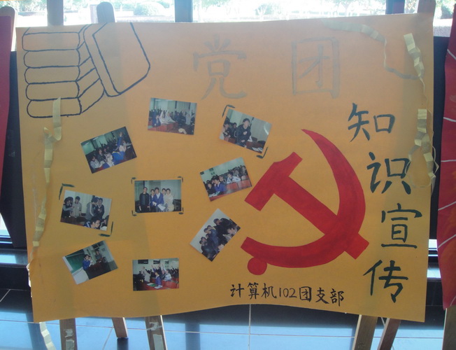 为了丰富同学们的精神文化生活,增进同学们对党团的认识,深入贯彻十七届五中全会精神,本次党团知识宣传周各班级积极开展了内容丰富、形式多样的党团知识学习。同时各班级将自己对党团的热爱与认知用一张张精美而简约的海报展现出来。海报上,一张张宣传周内同学们积极参加活动竞赛的照片,一句句发自内心肺腑的话语,都传达了同学们对党、团的真切情感。其中,计算机104班以紧握的拳头形象吸引了大家的眼球,简单的图画下蕴藏的是同学们紧跟党走的坚定信念,表达了他们身为团员的品质与目标——坚定不移地向党靠拢。