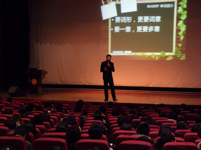 胡柏松老师首先向大家传述了四六级的听力经验。他以听力占总分的百分比告诉全场同学听力部分的重要性,并以对听力各类选项的规律性分析传述听力题目相关技巧。期间,胡柏松老师幽默风趣的讲解,赢得场下掌声连连。紧接着,由韩甦老师讲述笔试方法。他用简单的不等式“作文的形式>句式>单词”来具体化写作技巧,还告诫在座考生们一定要注重作文格式,字迹清晰。他还以九宫格的形式现场教学,记忆单词的便捷方法。讲座的最后,韩甦老师更是鼓励信息学子们要有自信,要认识到自己是优秀的,以积极的态度对待考试。