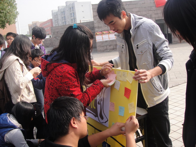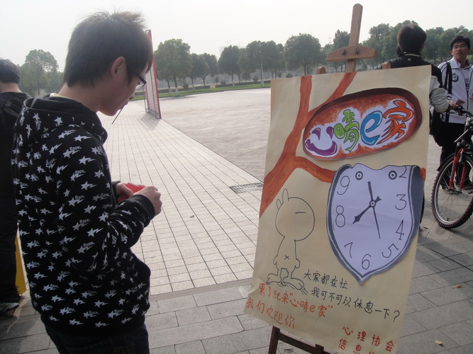 活动以“在小纸片上写上自己内心的话,并留下联系电话”的形式展开。标有“随心漂流”的留言墙被置于露天广场北侧,同学们纷纷在心情卡片上写下自己的心情,同时也读取了其他人的想法。虽然纸上只有几句话,但是在这只言片语中同学们诚实地表达了自己的想法,述说了自己的喜怒哀乐。“我希望大家的心情跟今天的天气一样晴朗”、“我脚底生风,跃跃欲试,迫不及待地想飞去未来闯”……那一张张小卡片承载着的是一颗颗透明的心,那些对家的思念,对真情的渴望,对苦闷生活的反感,对奇幻未来的憧憬……一份份心情都显得那么生动鲜活。通过陌生的号码,认识陌生的人,然而此人却有着与自己一样的心情,那份相通的情谊就此结下。
