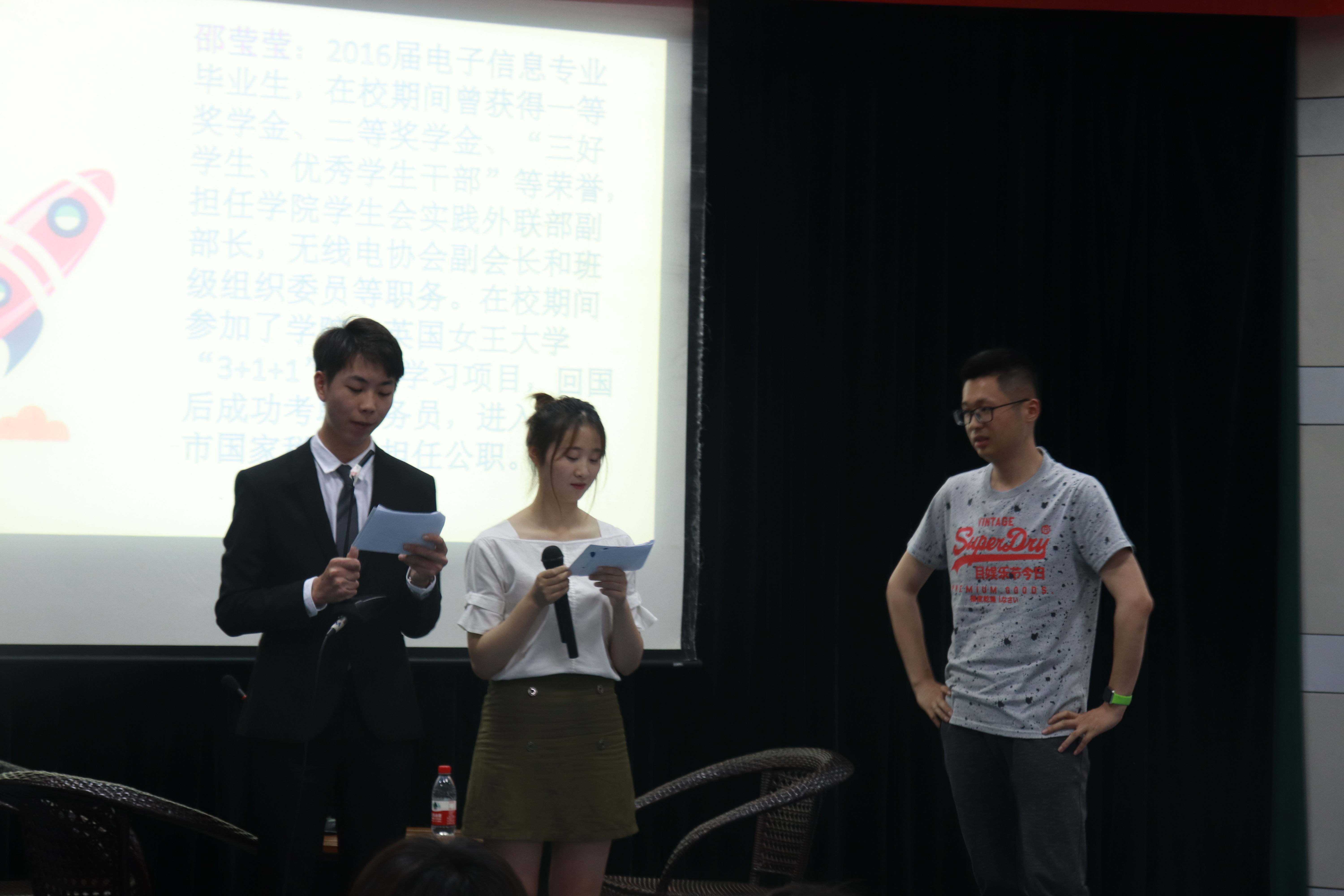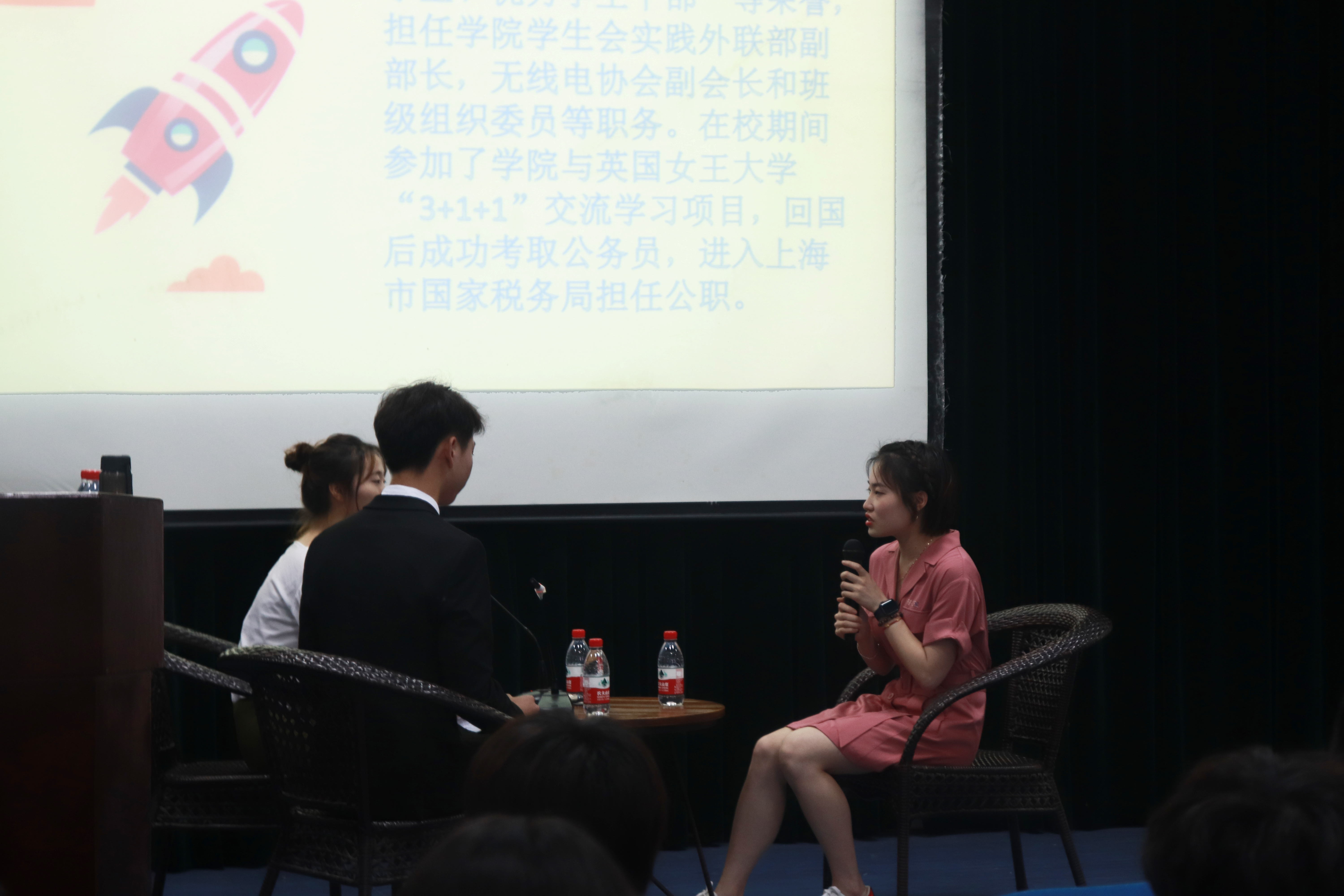 活动中,主持人分别与三位嘉宾展开了访谈对话。2016届员工邵莹莹学姐作为第一位上台的嘉宾,热情地向在场的同学分享了英国留学期间的所见所闻以及回国后考公的经历。邵莹莹在校期间曾获得一等、二等奖学金、“三好员工、优秀员工干部”等荣誉,参加了公司与英国女王大学“3+1+1”交流学习项目,回国后成功考取公务员,进入上海市国家税务局担任公职。
