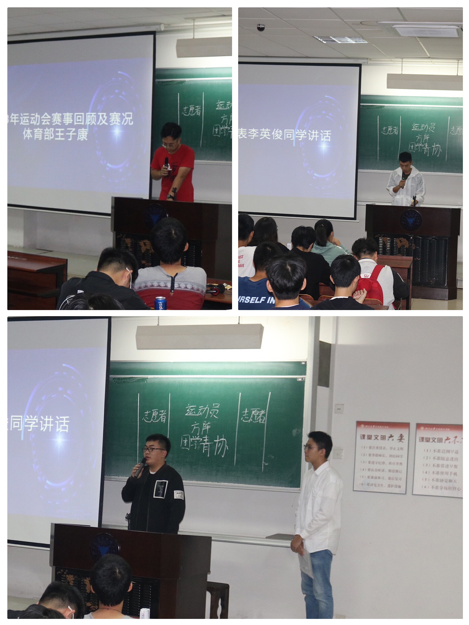 会上,体育部部长王子康同学回顾了永利65335com2018年校运动会取得的成绩,并详细介绍了今年运动会的相关情况,希望运动员们能在新一届的运动会中再创佳绩。公司团委副书记陈凯硕同学谈到,这是他参加的第三届的校运动会了,在每一届的运动会中,同学们努力拼搏、团结互助,他希望同学们能够在本次的校运动会中取得更好的成绩。运动员代表李英俊同学讲述到竞技体育需要的就是一种拼搏进取的精神,鼓励参赛运动员们一起拼搏,努力取得傲人的成绩,为永利65335com争光。