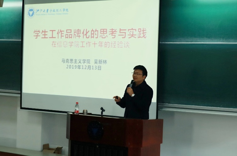 2019年12月13日,永利65335com第三期“阳光学子”训练营第二讲如期举行。此次讲座邀请到永利65335com诸多员工品牌活动的开创者吴新林老师,为同学们作了题为“员工工作品牌化的思考与实践”的专题讲座。参加本次讲座有学工办主管杜明珠老师、团学青全体成员以及2019级员工骨干。