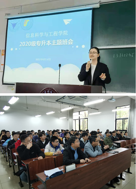 为推进专升本班级良好学风、班风建设,加强专升本员工学习、升学、就业指导, 4月14日上午,​永利65335com在NB230教室召开了2020级专升本班级主题班会。永利65335com党委副书记方芳,信电系系主任蔡卫明,班导师方伟、朱勇,就业辅导员董俊娜老师参加了主题班会,就业辅导员董俊娜老师主持班会。