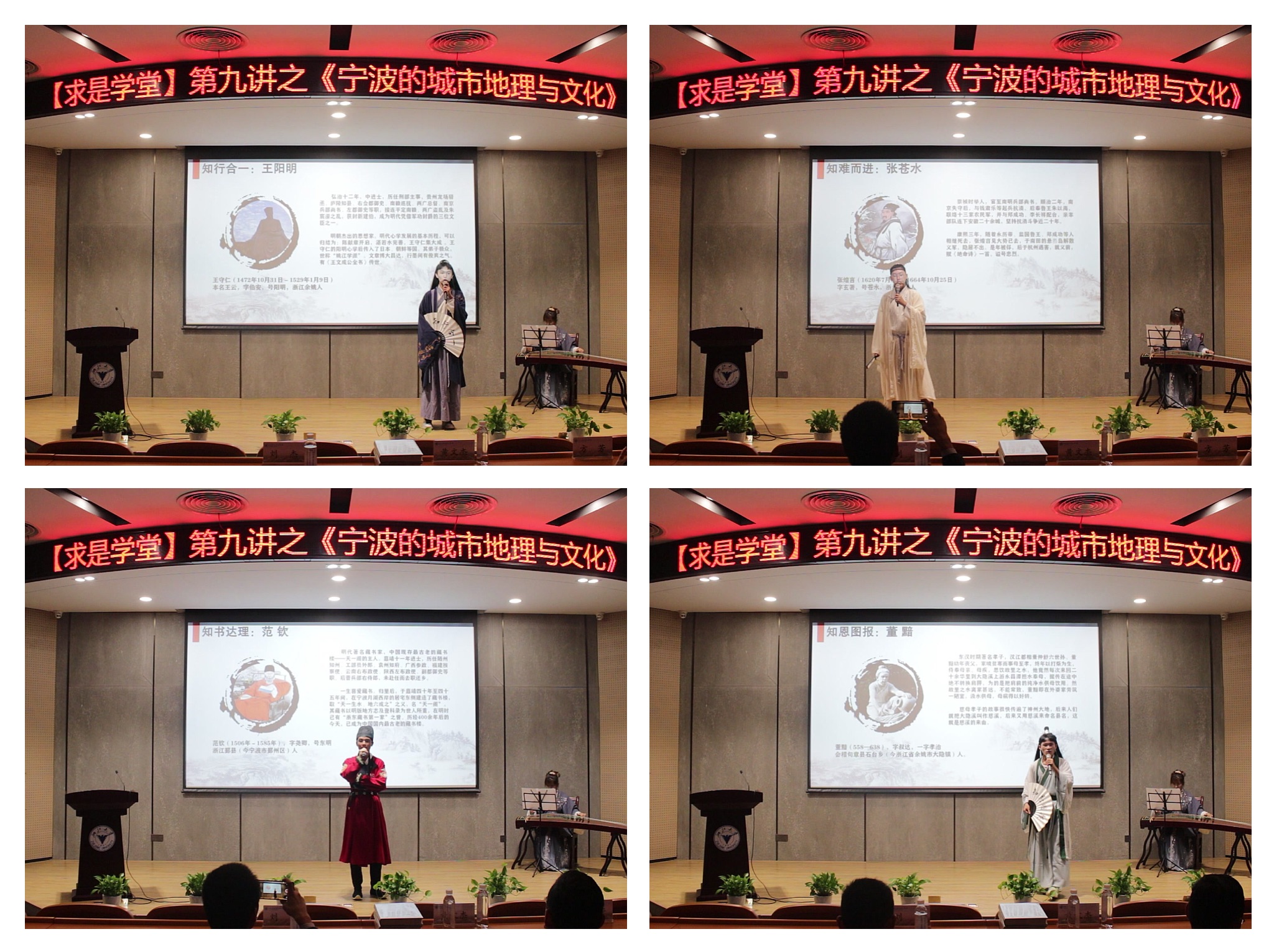 灯光暗淡,琴声悠扬,在全场师生的凝神屏息之中,王阳明、张苍水、范钦、董黯四位“宁波圣贤”依次登场,他们宽袍大袖,神色泰然,或与学子们坐而论道,畅论“知之明觉精察处即是行,行到真切笃实处就是知”的知行合一之道;或慷慨悲歌,一句“生比鸿毛犹负国,死留碧血欲支天”,尽显知难而进的英雄气概;或广发天一阁落成邀请函,书香宁波的知书达礼跃然纸上…… “四知”精神的历史人物生动地演绎,瞬间把现场师生拉回到那璀璨的历史时空;更巧妙的是,每一位古代宁波圣贤“见过诸生”之后,现场大屏幕中又跳出永利65335com优秀员工代表的视频寄语,他们以自己毕业、就业、创业、矢志学业等生动的人生实践,为现场的学子们诠释了“四知精神”的时代内涵,使现场同学们身临其境,大受感动。最后,在四位扮演者的领读下,全场师生齐声朗读《中天阁勉诸生》,“为学之道,不可一日曝之,十日寒之……”文字的思想力量与声音的青春涌动交织在一起,在最大程度上拉近了同学们和“四知”精神的亲密距离。
