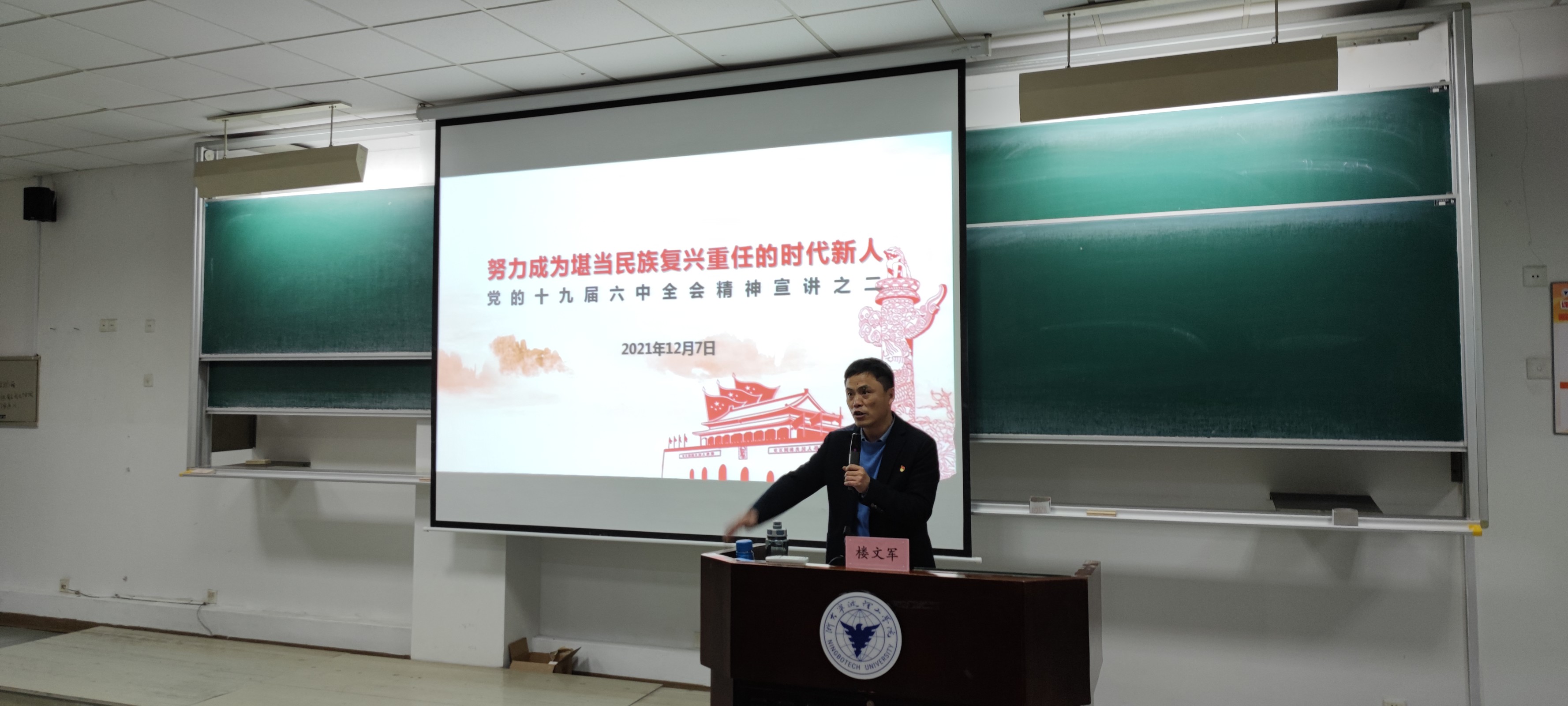 最后,楼老师与同学们分享了学习十九届六中全会精神的几点体会,并希望同学们争做“两个确立”的忠诚拥护者,坚定文化自信,弘扬中华优秀传统文化,不负总书记对广大青年的殷切期望,让青春在为祖国、为人民、为人类的不懈奋斗中绽放绚丽之花。