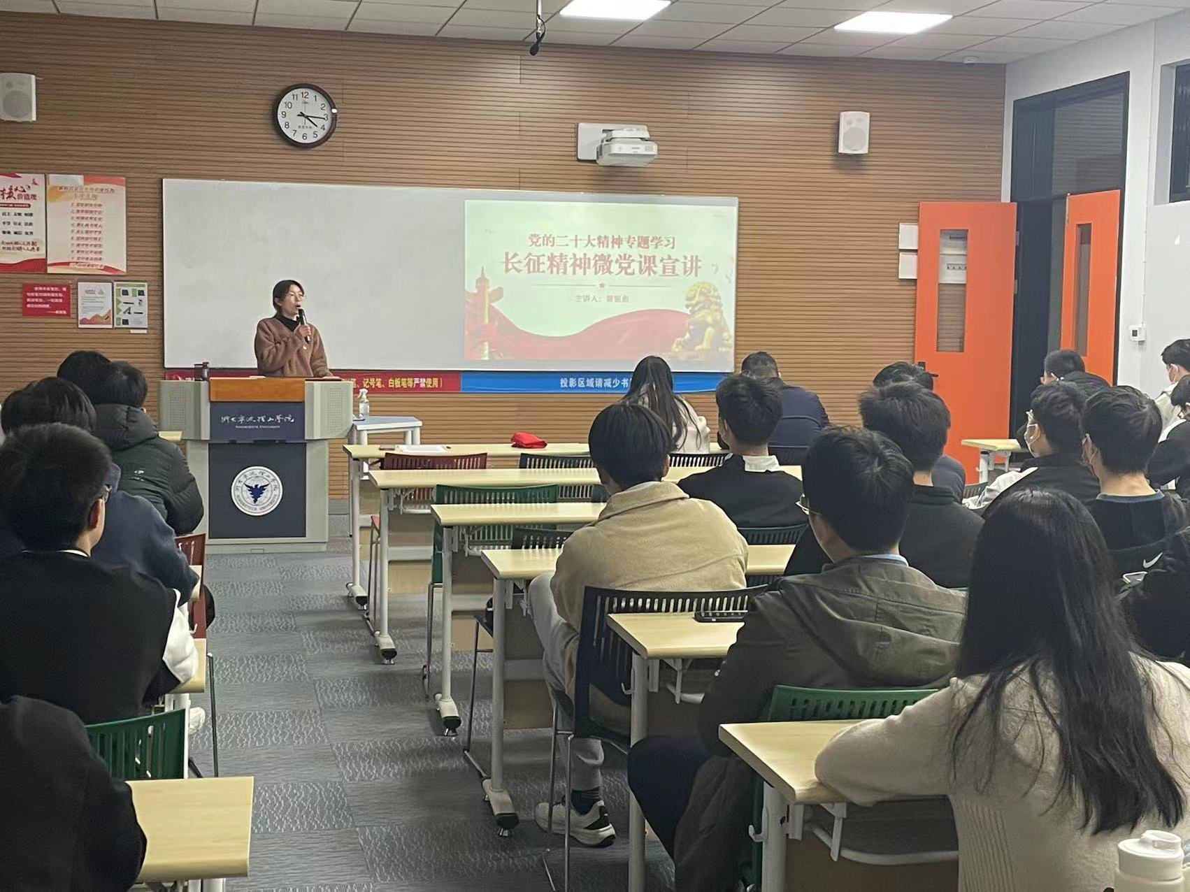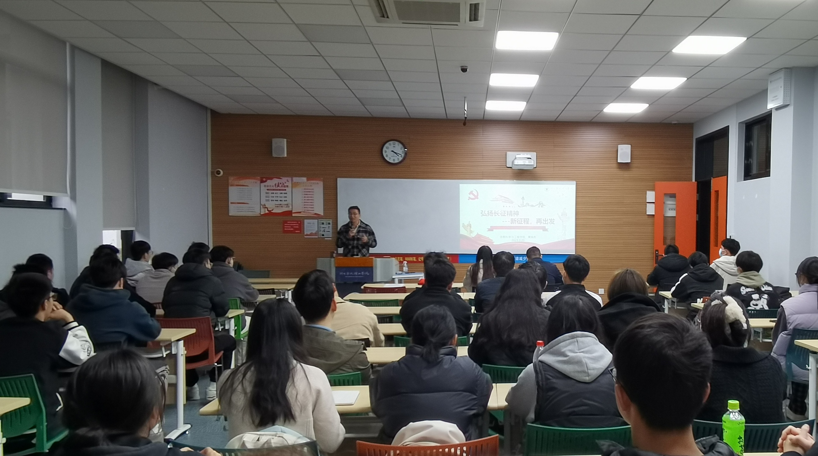 信电员工党支部黄振彪老师以“弘扬长征精神,新征程再出发”为题,围绕战争先锋、和平楷模、身边榜样三个不同时期的典型人物或群体展开,讲述不同时期不同人物故事,从故事中引导党员同学们学习他们身上展现出的长征精神。黄老师强调,一代人有一代人的梦想,一代人有一代人的“长征”,长征精神需要更多的年轻人去传承和践行。他呼吁在座的党员同学,作为新时代的追梦人,老员工奔走在新时代的长征路,应该朝气蓬勃,努力奋进。