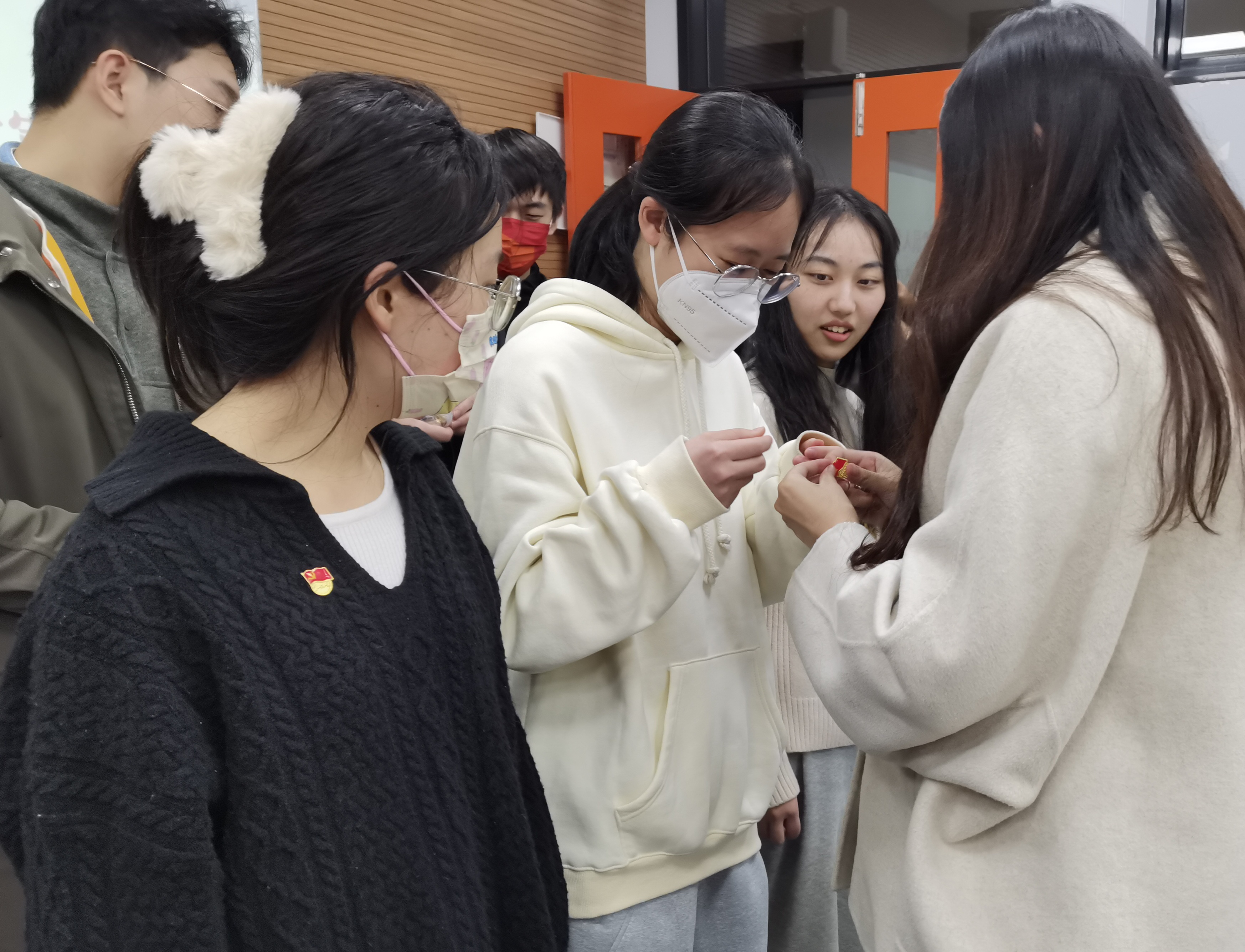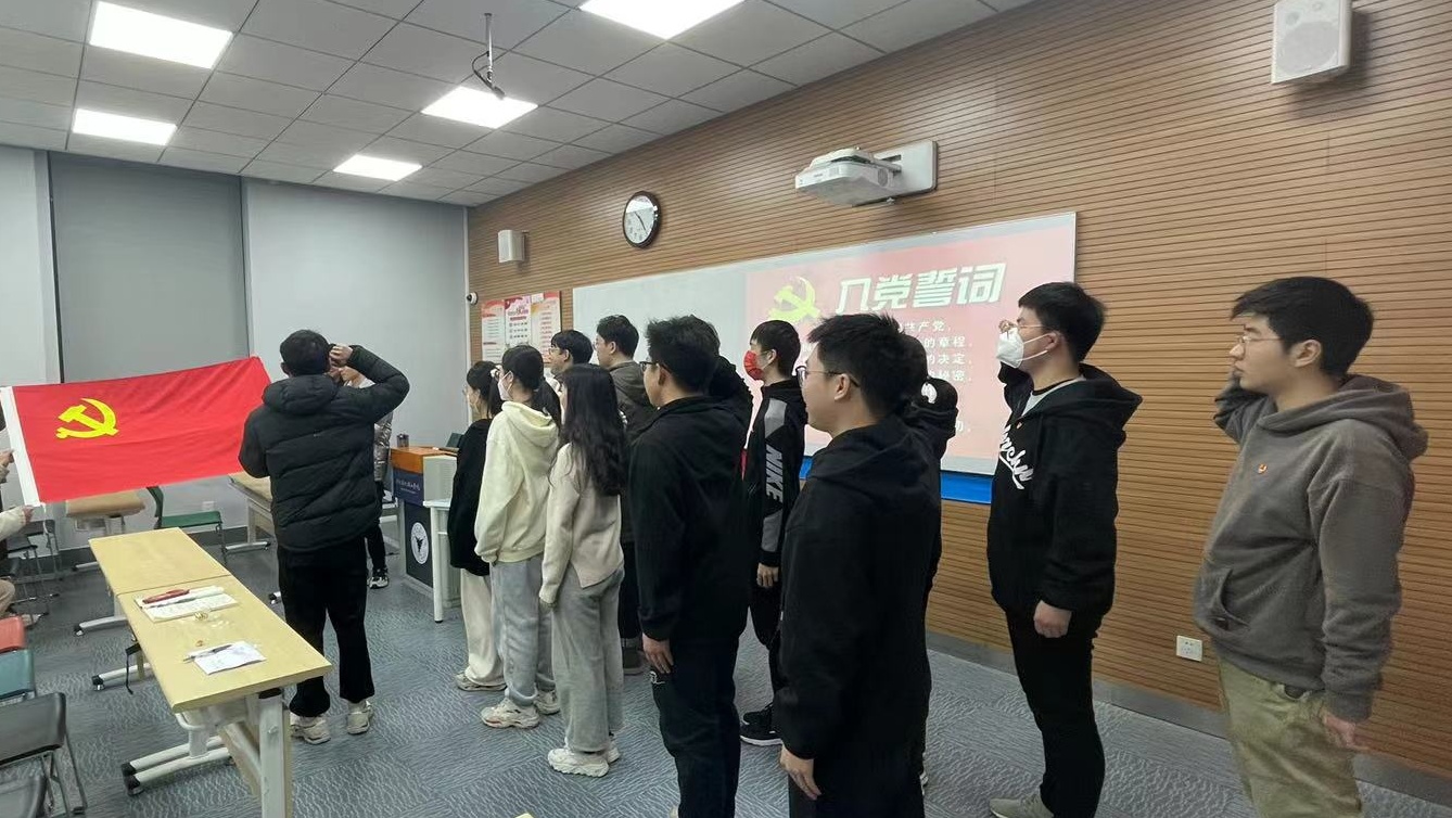 活动最后,公司为去年12月份新发展的党员同学举行宣誓仪式。电气员工党支部书记蒋鹏涛、辅导员李青倩为12名新党员佩戴上象征党员身份的党徽。