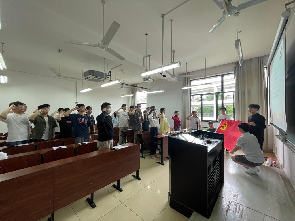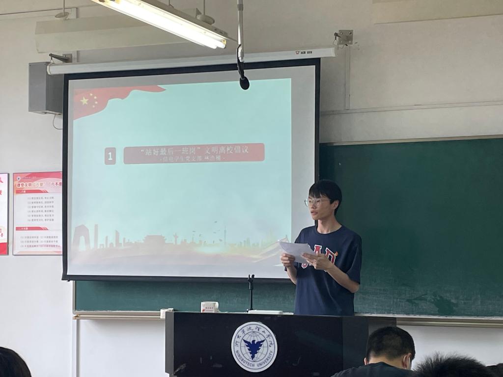 会上,信电员工党支部林浩楠同学号召全体毕业班党员文明离校。他围绕党的理论学习、青年责任担当、服务同学、文明离校等几个方面做出了倡议,并代表毕业生党员进行承诺。他强调作为员工党员毕业之后也要严格要求自己,在工作岗位上继续学习,扎实工作,努力在工作岗位上做出成绩,同时,常怀感恩之心,为母校争光,为党旗添彩。随后,全体到会毕业生党员同志在庄严的党旗下宣誓,共同重温了入党誓词,再次牢固理想信念。