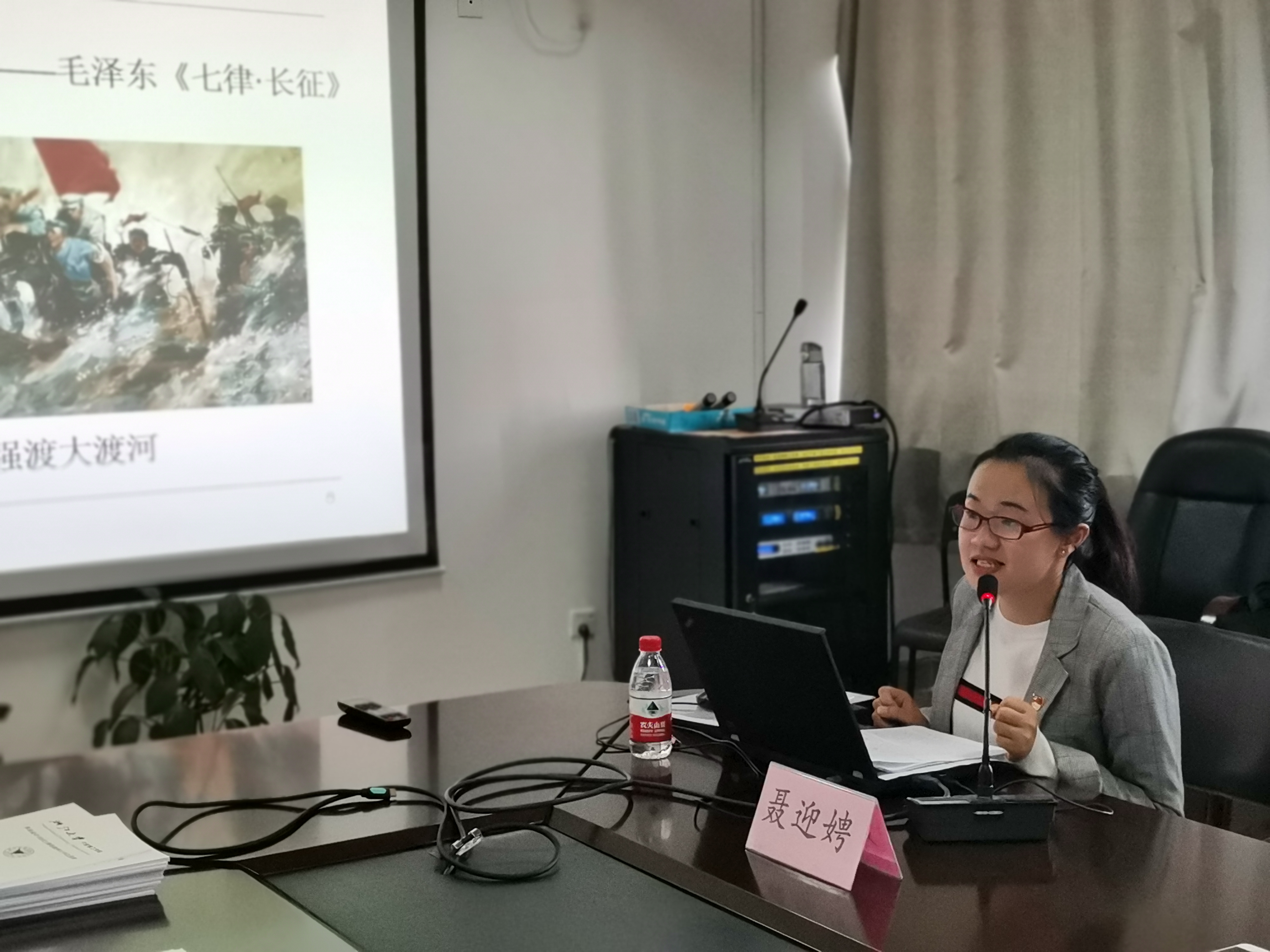 聂老师首先以无产阶级革命家董必武先生的诗作“革命声传画舫中,诞生共党庆工农。重来正值清明节,烟雨迷蒙访旧踪。”开场,用生动又富有故事的微小细节详细描述了红船的历史渊源,再现了当年那一伟大的历史时刻。接着用历史与现代融汇结合的方式详细阐述了红船精神的内涵与意蕴三个方面:开天辟地,敢为人先的首创精神、坚定理想,百折不挠的奋斗精神、立党为公,忠诚为民的奉献精神。最后就弘扬红船精神谈了自身的感想与体会。