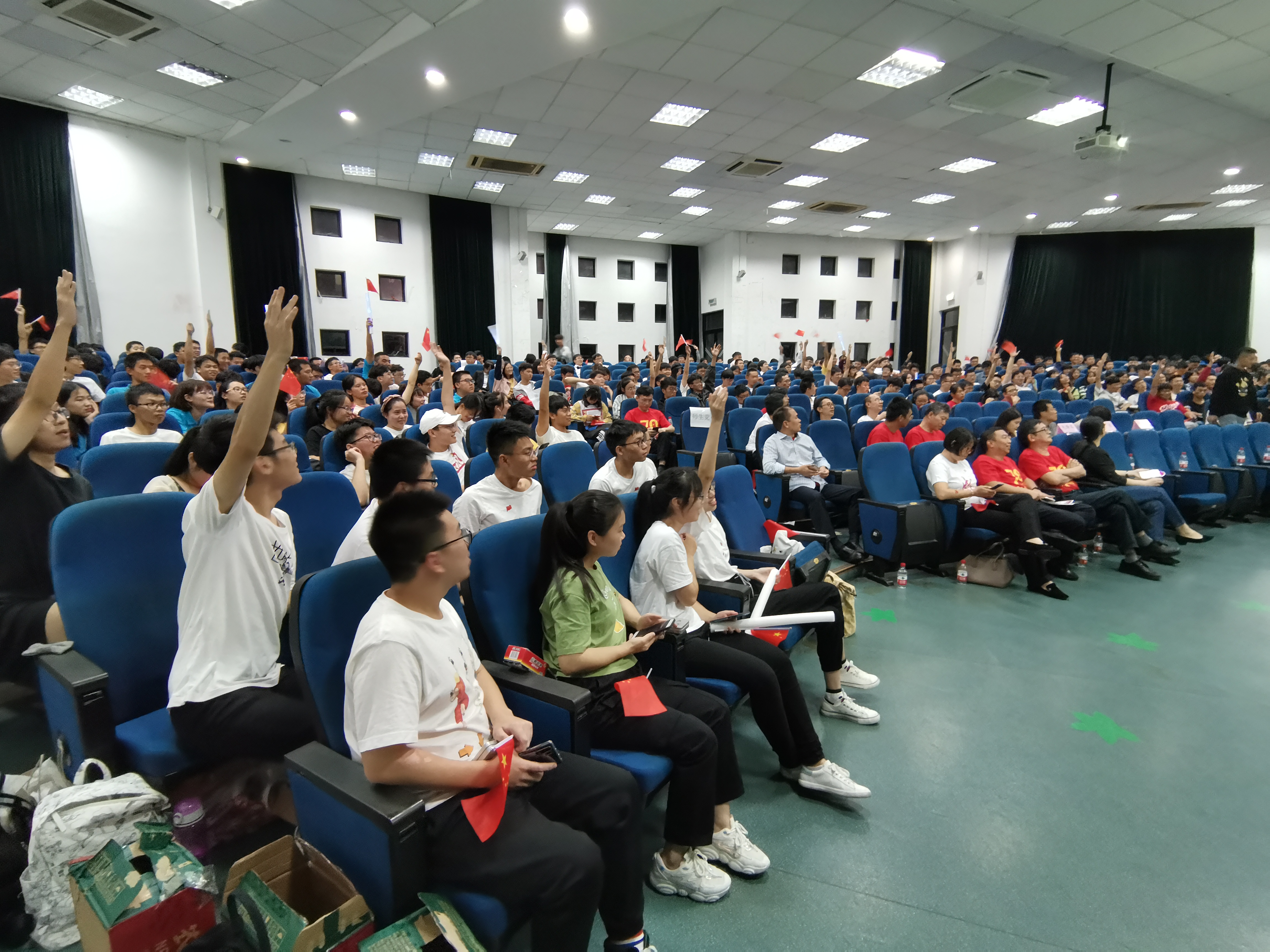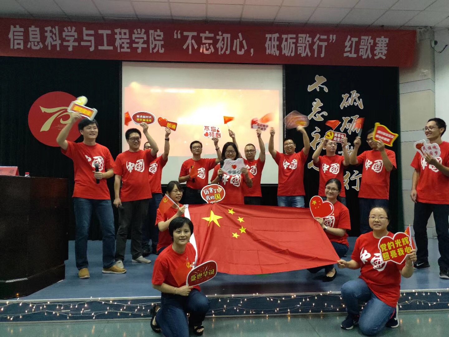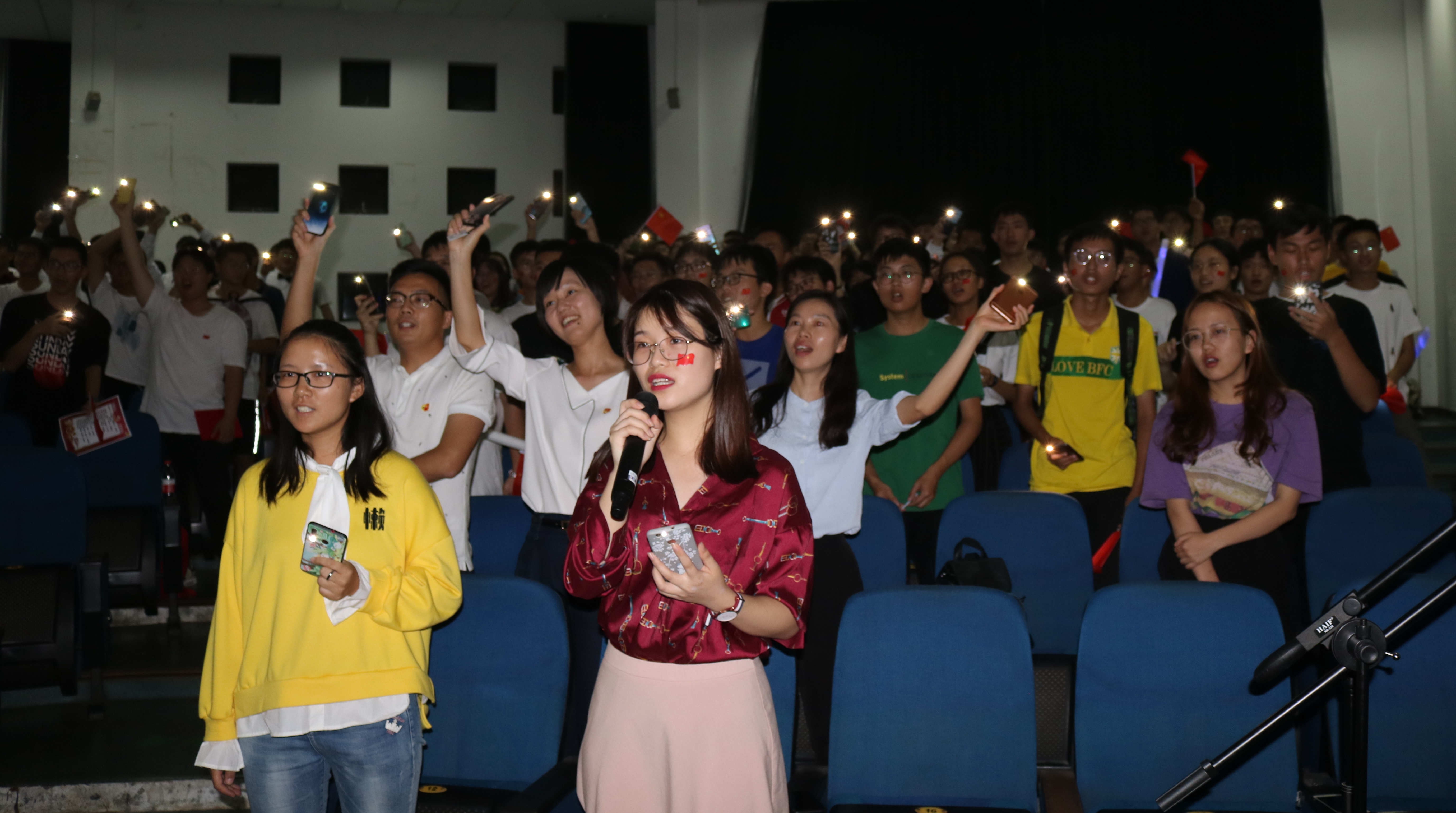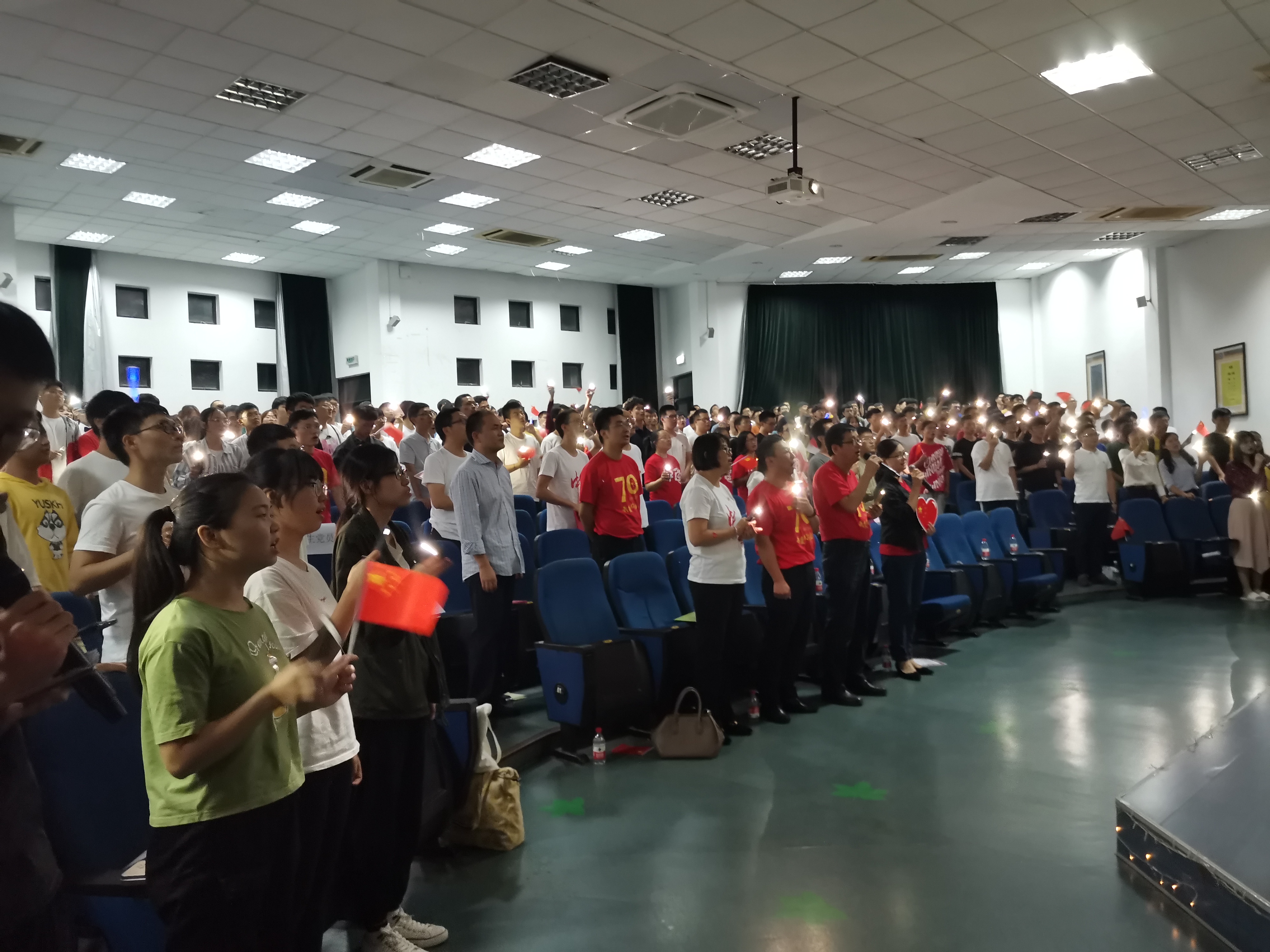当《我和我的祖国》的悠扬旋律再次响起时,会场全体师生起立合唱,伴随着手中摇动的“点点星光”,本次迎国庆红歌献唱活动圆满落幕。