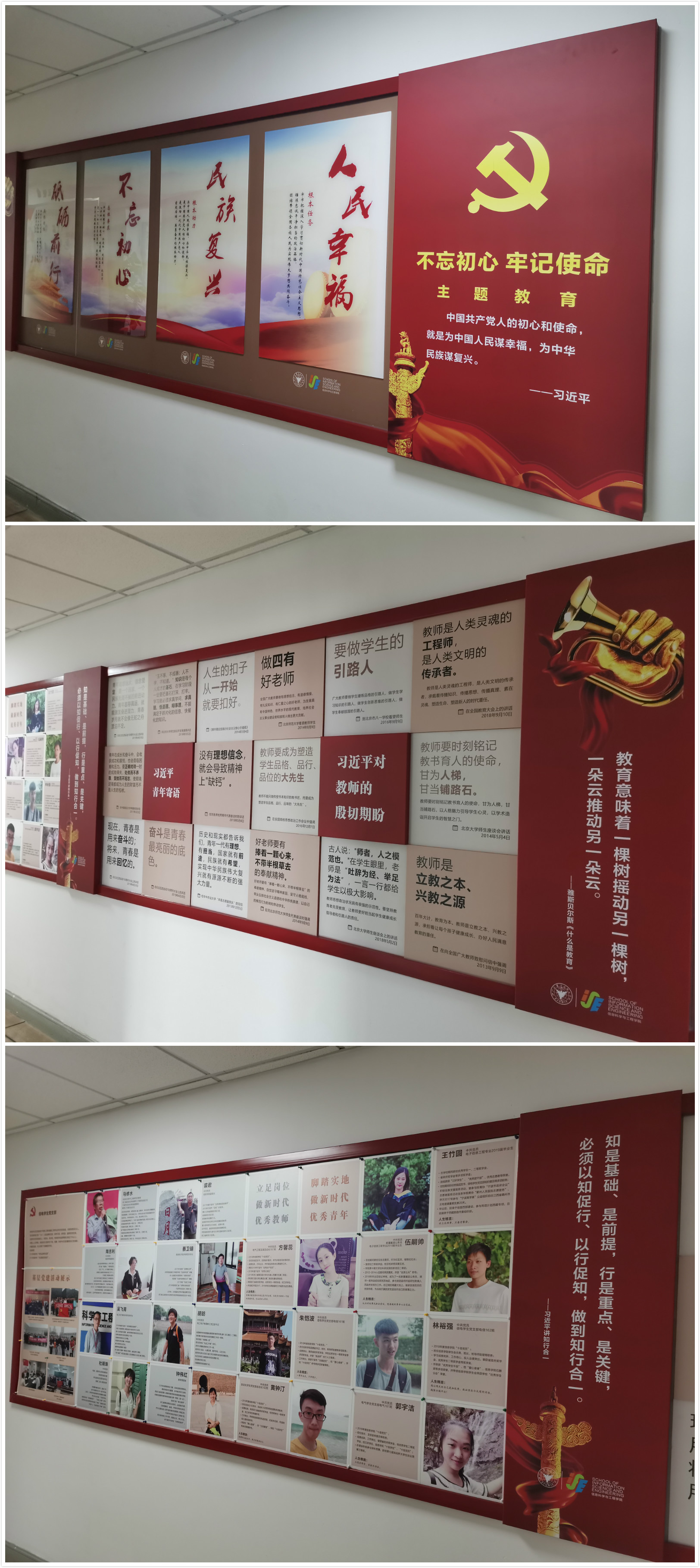 党建宣传墙共分三部分:以主题教育的根本任务、根本动力、总体要求和具体目标为引领;以教育为初心,重点展示了习近平总书记对教师的殷切期盼和对青年的寄语;此外,集中展示了一批脚踏实地、立足岗位的优秀员工和优秀教师的典型事迹。