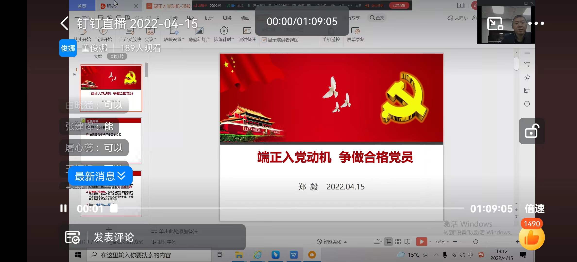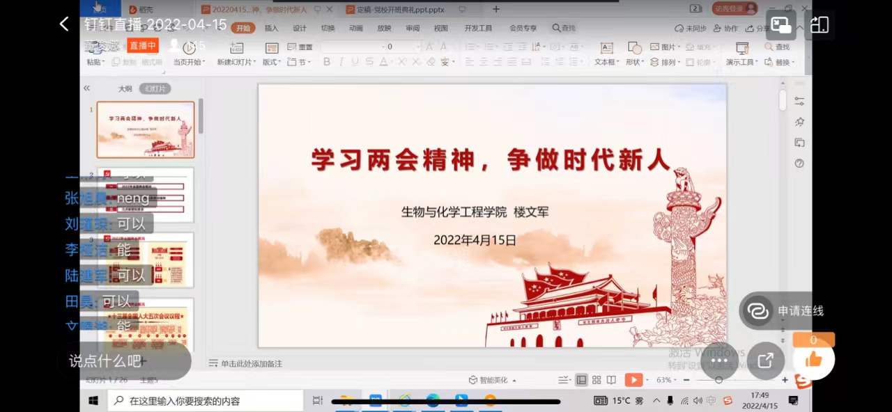 4月15日,党校第42期入党积极分子培训班生化永利65335com党委、数据永利65335com党委、材料永利65335com党委和永利65335com党委联合教学班顺利开班。根据疫情防控工作要求,本次开班典礼及培训采用线上直播方式。生化永利65335com党委副书记楼文军、数据公司思政主管王常青、生化公司思政副主管闫雪茹、材料公司思政副主管包静昇出席了此次开班典礼。仪式由永利65335com董俊娜主持。