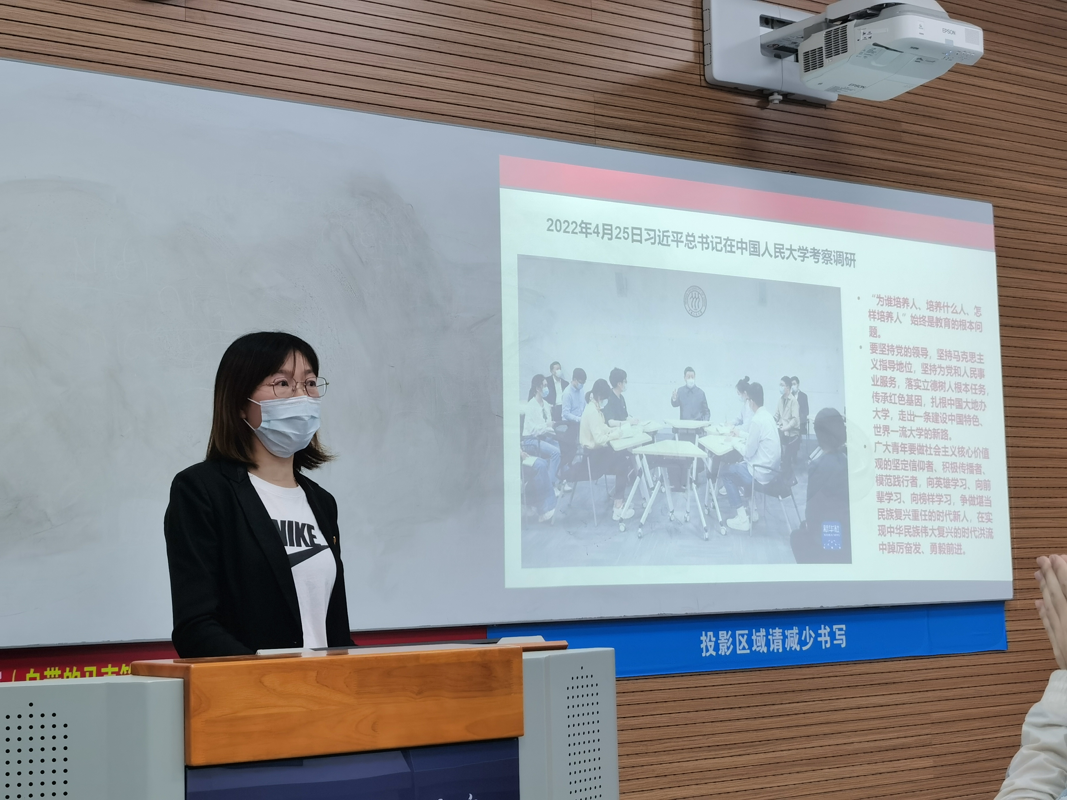 随后,支部书记董俊娜老师带领全体党员学习习近平总书记考察中国人民大学重要讲话精神。她号召党员同学积极传承红色精神,要立足现实脚踏实地把学习抓牢,充分锻炼提高综合素养,做学习的先锋者,要敢立志、立大志、勇担当,争做堪当民族复兴重任的时代新人,有信心在实现中华民族伟大复兴的时代洪流中勇毅前行。