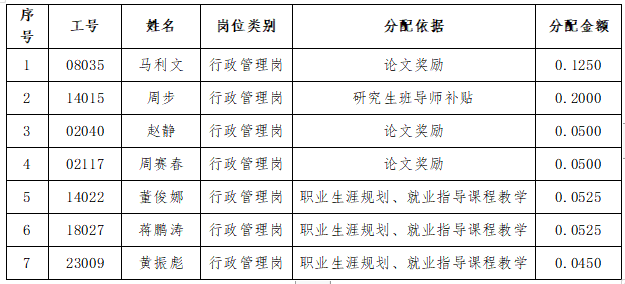 根据公司人事处关于2023年度绩效(考核)奖励发放说明的要求,按照公司第六轮聘岗期间年终考核奖励分配方案,现对公司行政管理岗(含思政辅导员)参与教师业绩分配结果进行公示: