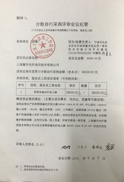 永利65335com单频保偏光纤放大器分散自行采购项目成交结果的公示