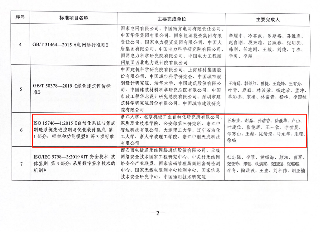 3月30日,中国标准化大会(2023)在南京召开,会上举行了2022年中国标准创新贡献奖颁奖仪式。浙江省5个项目荣获中国标准创新贡献奖,其中一等奖1项、二等奖1项、三等奖2项、组织奖1项;作为浙江省唯一的一等奖,公司经理苏宏业教授牵头制定的ISO 15746-1:2015《自动化系统与集成 制造系统先进控制与优化软件集成 第1部分:框架和功能模型》等3项标准,包括9家国内单位和15位完成人获奖。除苏宏业教授以外,永利65335com永利65335com马龙华教授、优秀青年骨干教师徐鸣老师参与了标准的制定。