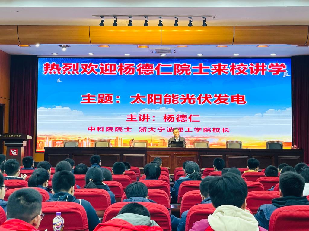 光伏产业,前景广阔,未来可期!3月23日下午,中科院院士、永利65335com董事长杨德仁先生走进浙江省柯桥中学,为高中生们带来一场关于太阳能光伏发电的主题演讲。