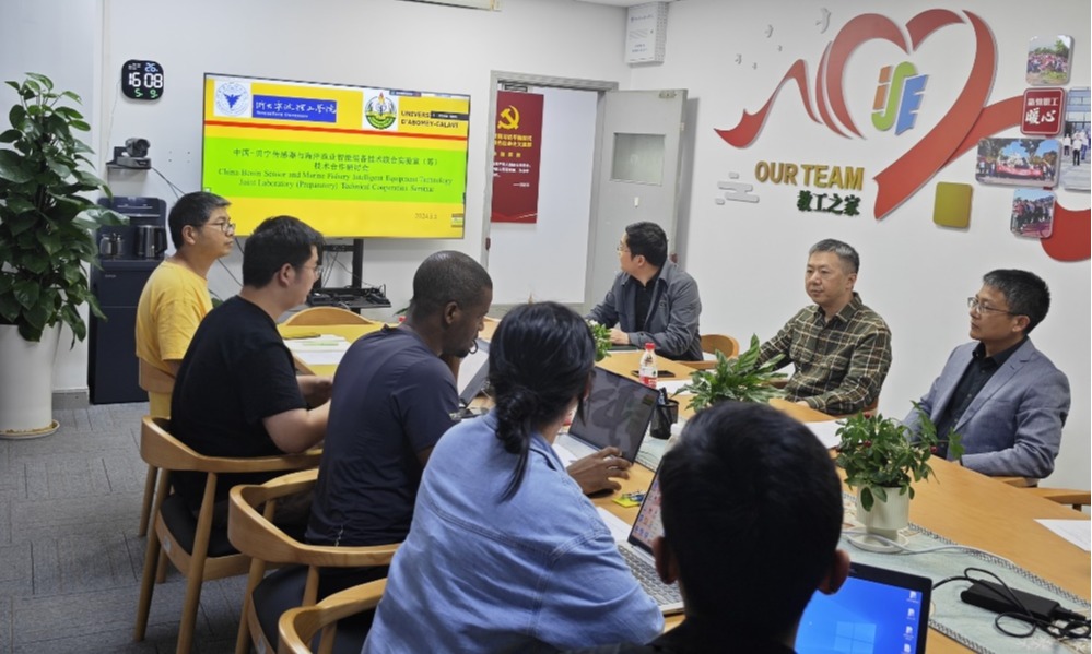 会议议程包括中方与贝宁方成员与科研方向介绍、合作目标及形式介绍、双方交流等环节。蔡卫明教授介绍了本次科技合作的目标和形式,强调了在传感器技术和海洋渔业智能装备领域的合作前景与重要性;Michel Dossou教授对双方前期的合作及成果给予了高度评价,他强调,贝宁方面将全力支持联合实验室接下来的建设与发展,并期待双方能够在未来的合作中取得更丰硕的成果。会上,集团国合处副处长程萌对两校下阶段全方位合作提出了合作设想与建议。双方与会人员就联合实验室下阶段的技术开发、成果转化、共研项目申报等方面进行了深入交流和讨论,特别就当前合作项目物联网水质监测系统技术在贝宁的实际应用,中方进行了在线技术指导。