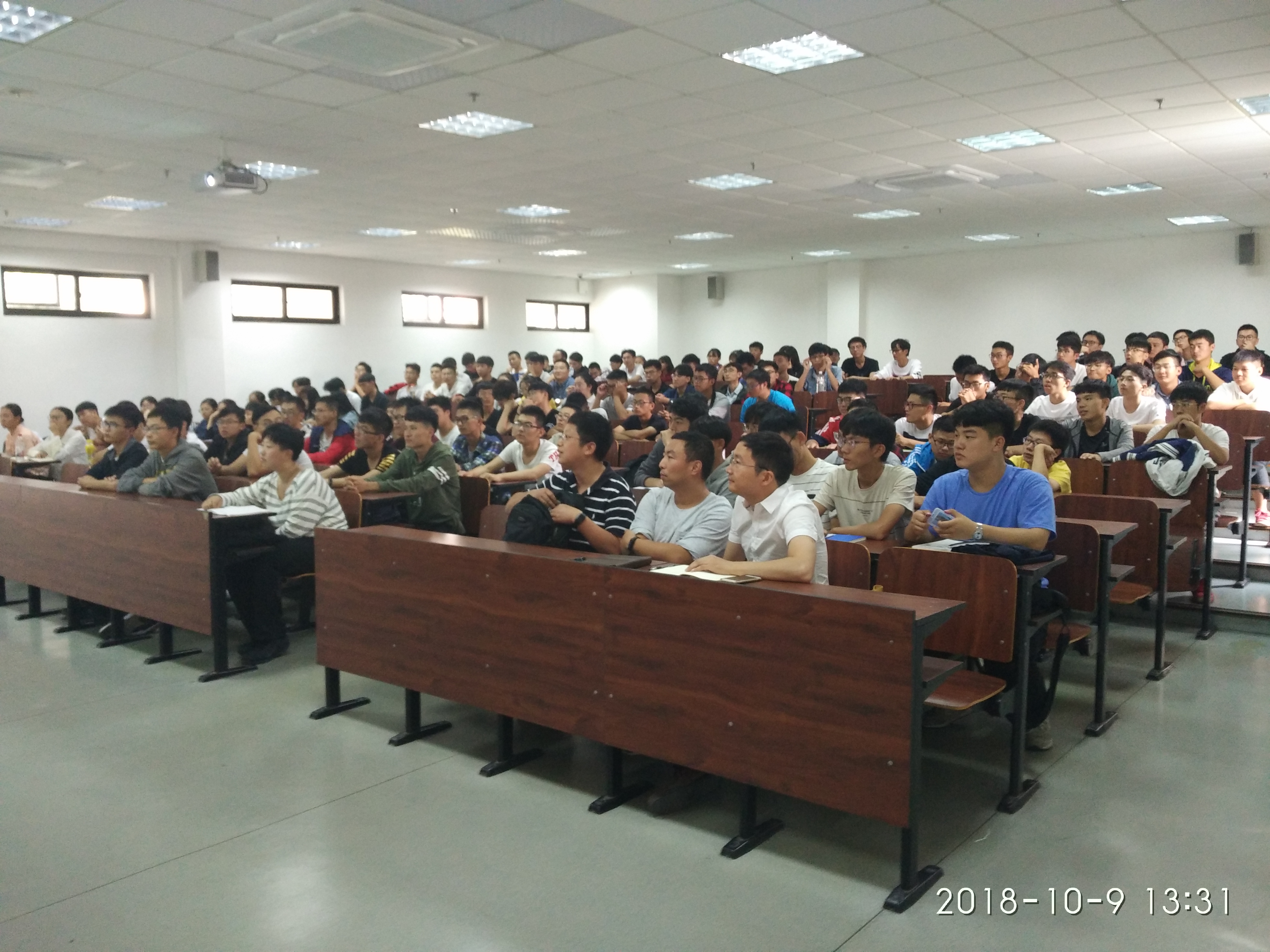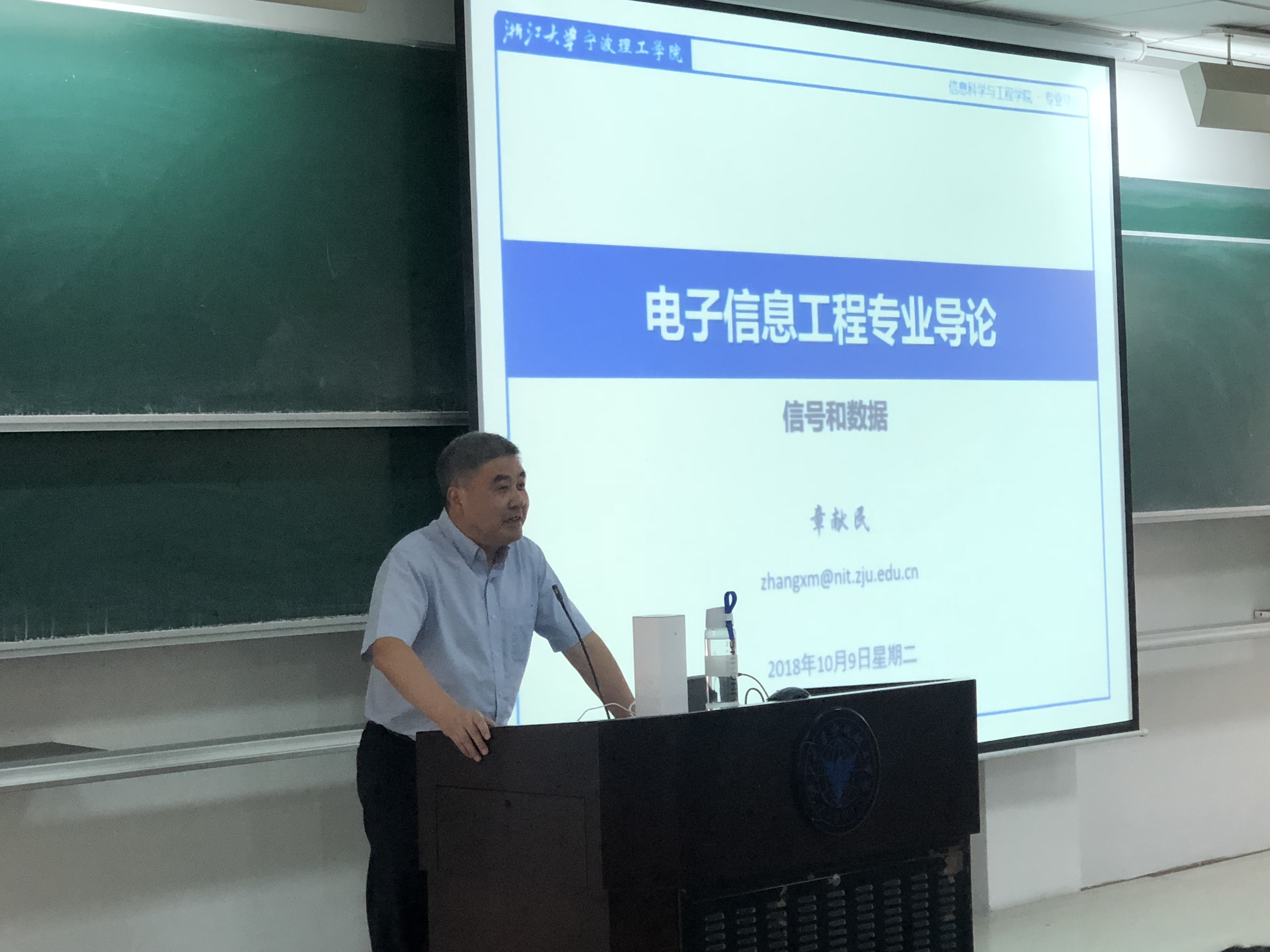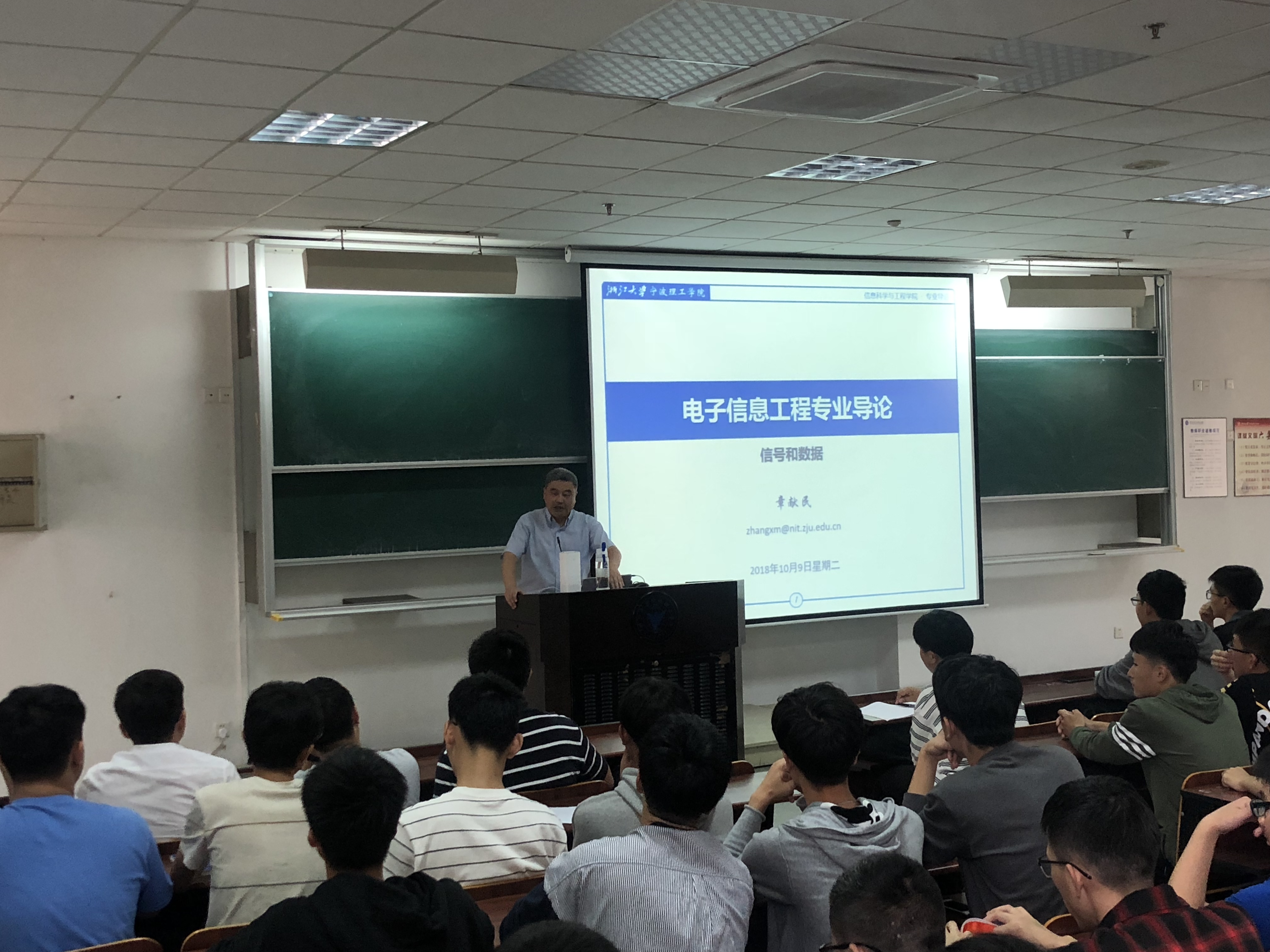 10月9日下午,浙江大学宁波理工公司章献民经理来到NF201教室,为2018级永利65335com新生上了一堂生动的电子信息工程专业导论课。2018级电子信息、自动化专业共120余名新生齐聚一堂,宽敞的教室座无虚席。