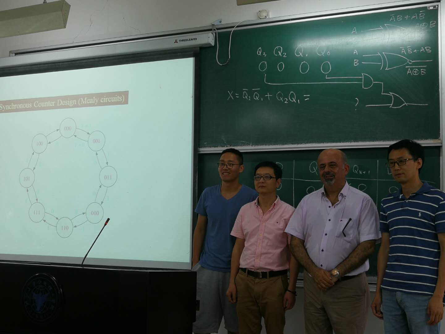 George教授围绕同步计数器的设计(Design of Synchronous Counters)进行了深入分析讲解,不时以轻松和幽默的语言引导员工积极讨论,其开放和自由的教学风格给员工留下了深刻的印象。教学结束后,George教授与电工电子所吴飞青副教授、赵祥红博士和信电所喻平副教授就教学方法、教材选用、教学进度安排等方面进行了深入交流。
